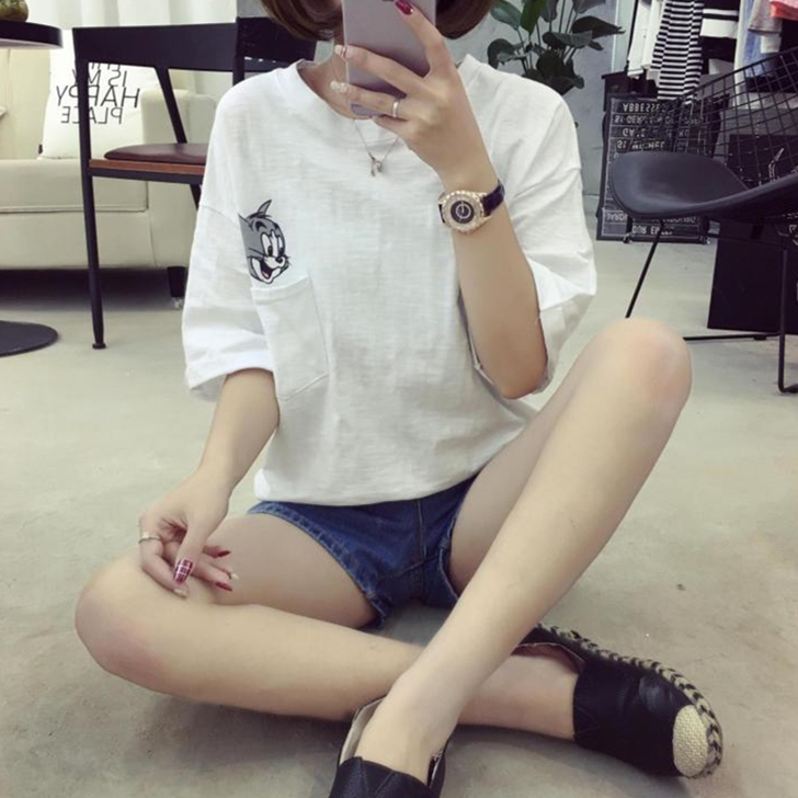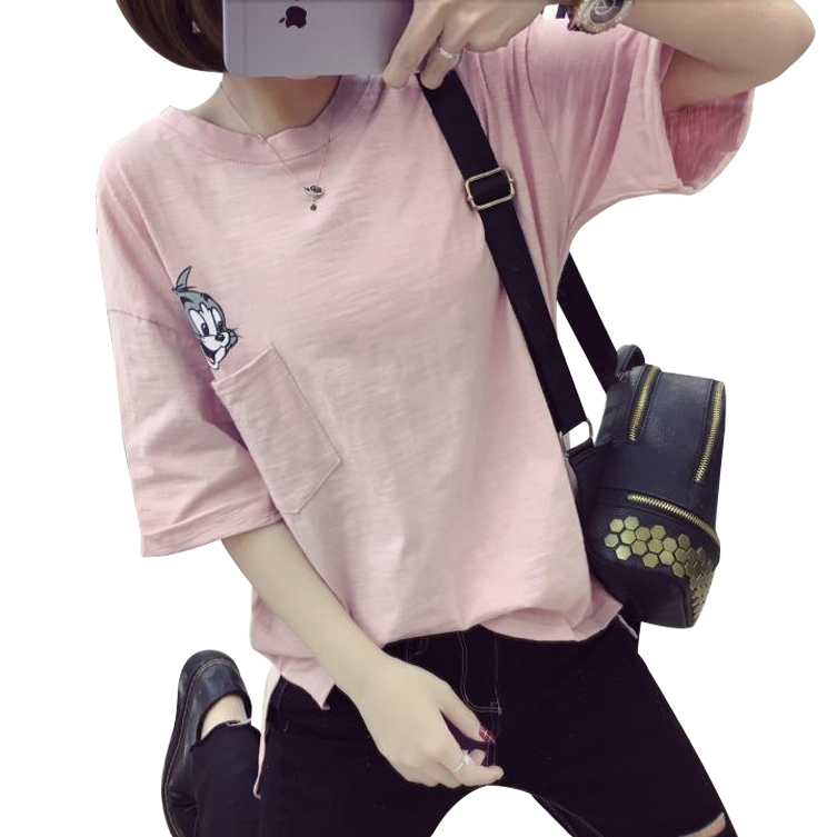 / 韓國夏裝卡通新款t恤女短袖女裝上衣寬松竹節棉中長款學生體恤衫