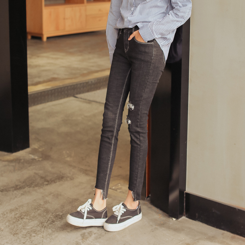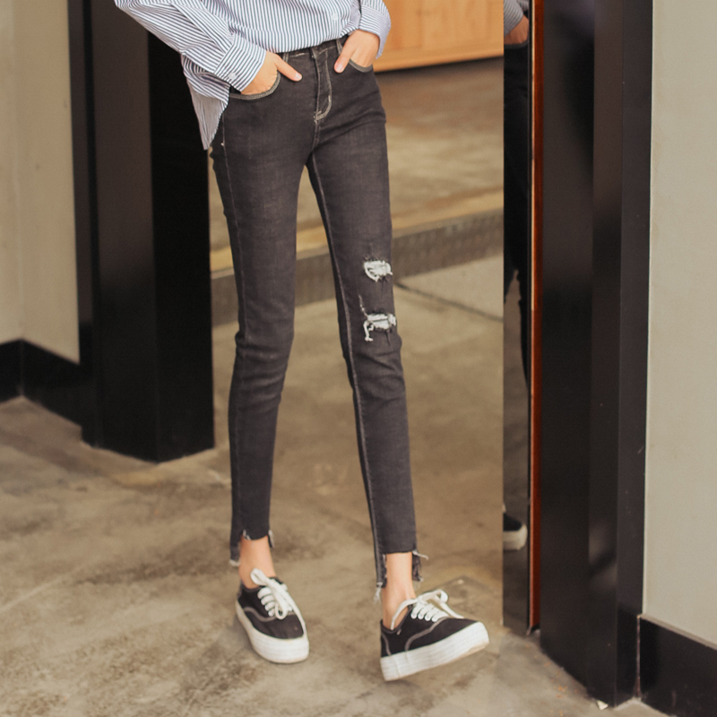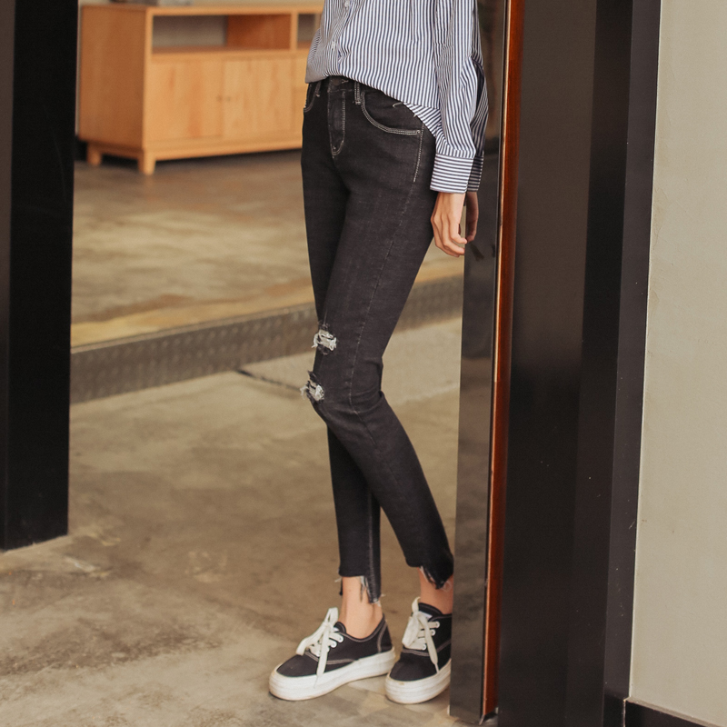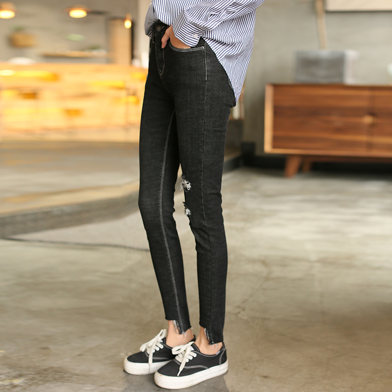 / 春秋新款韓版修身黑色破洞褲不規則高腰彈力牛仔女小腳褲子潮