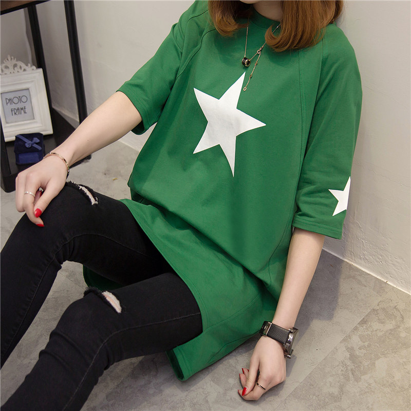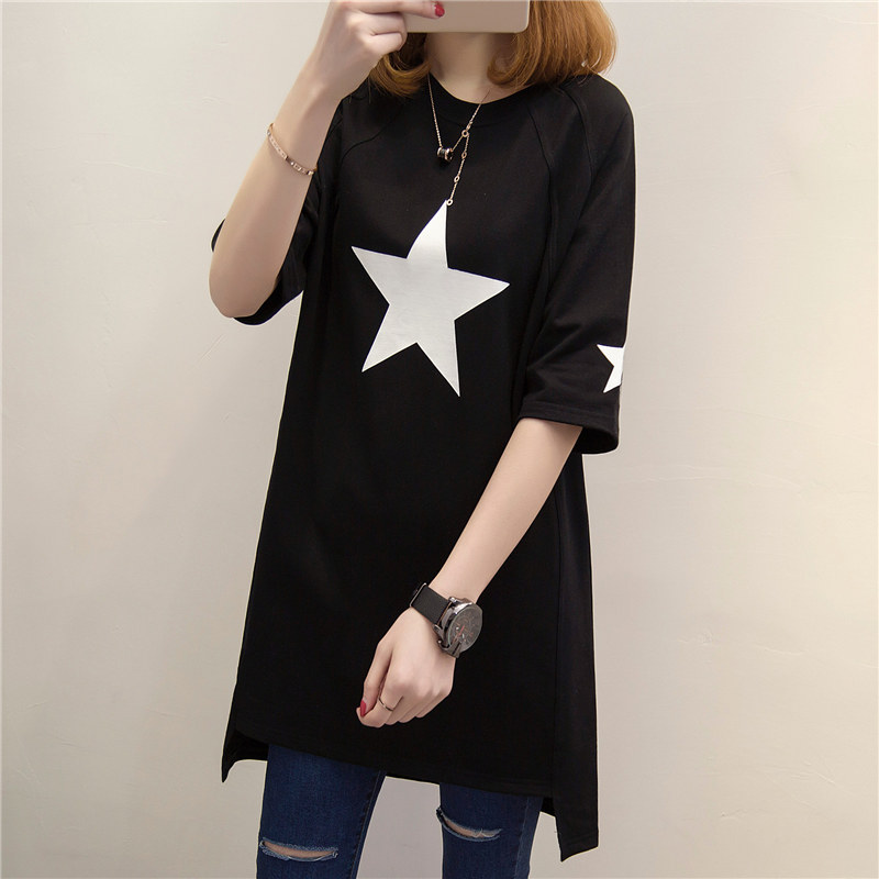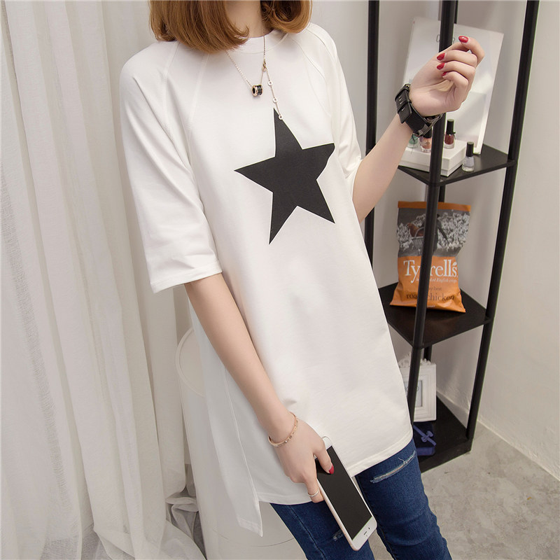 夏裝新款中長款t恤女短袖上衣寬松韓版百搭學生印花長款體恤
