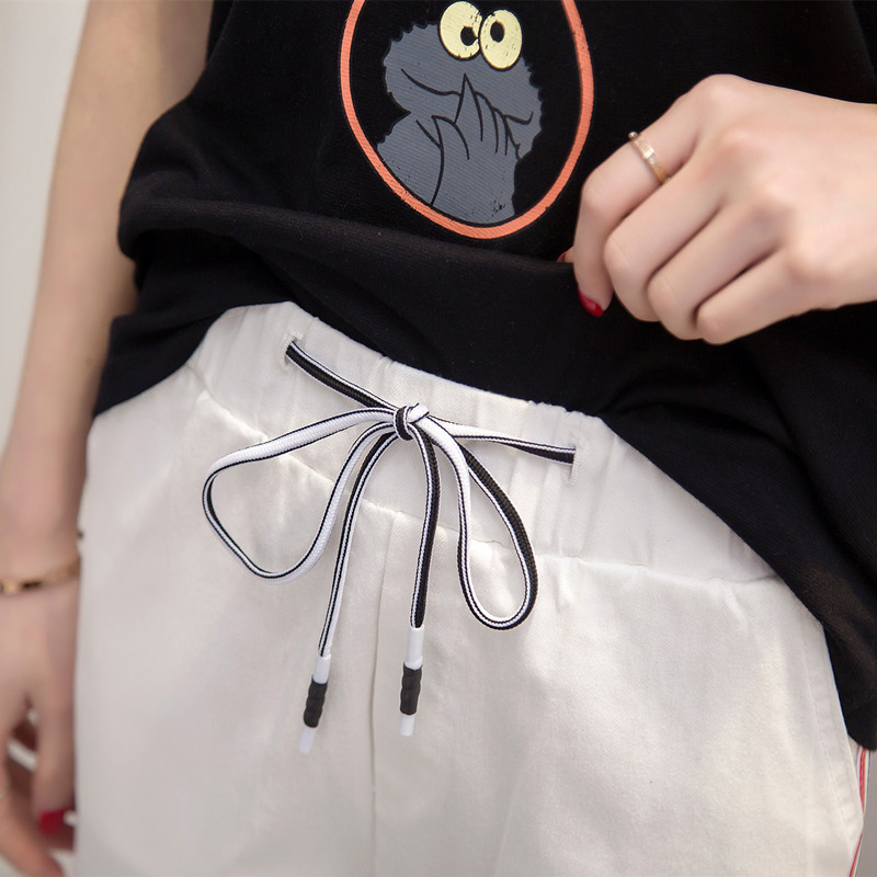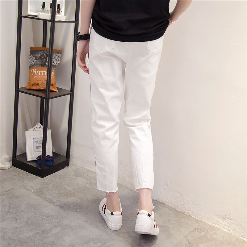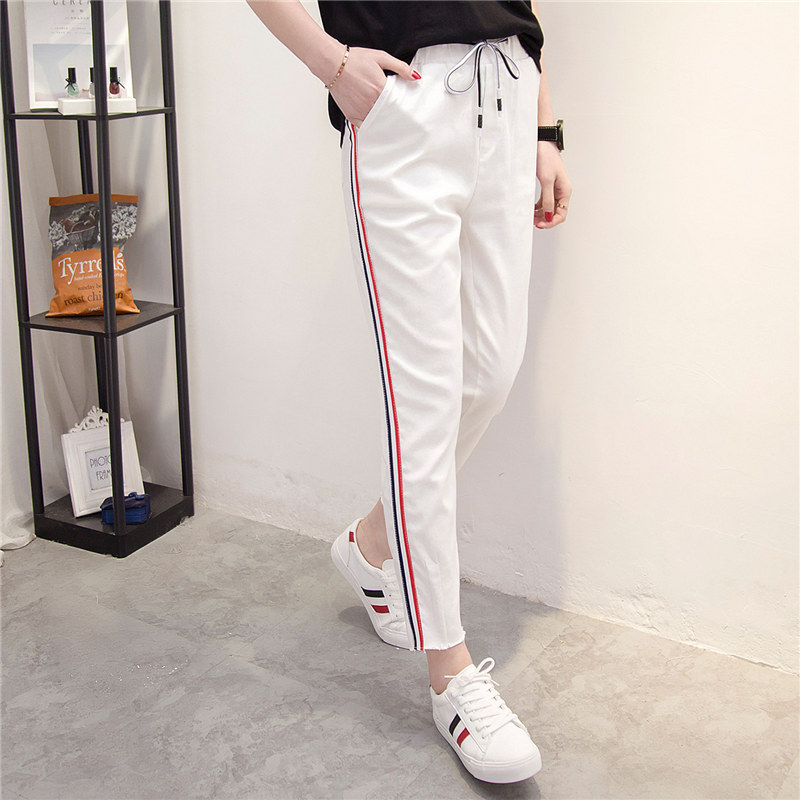 / 休閑褲女裝夏裝時尚新款白色九分褲寬松顯瘦條紋低腰小腳褲潮
