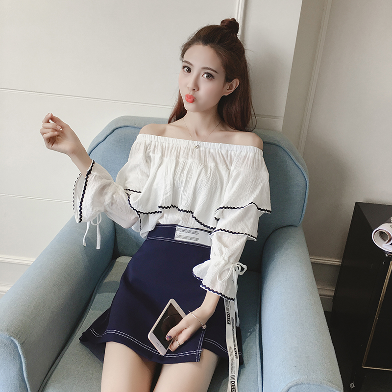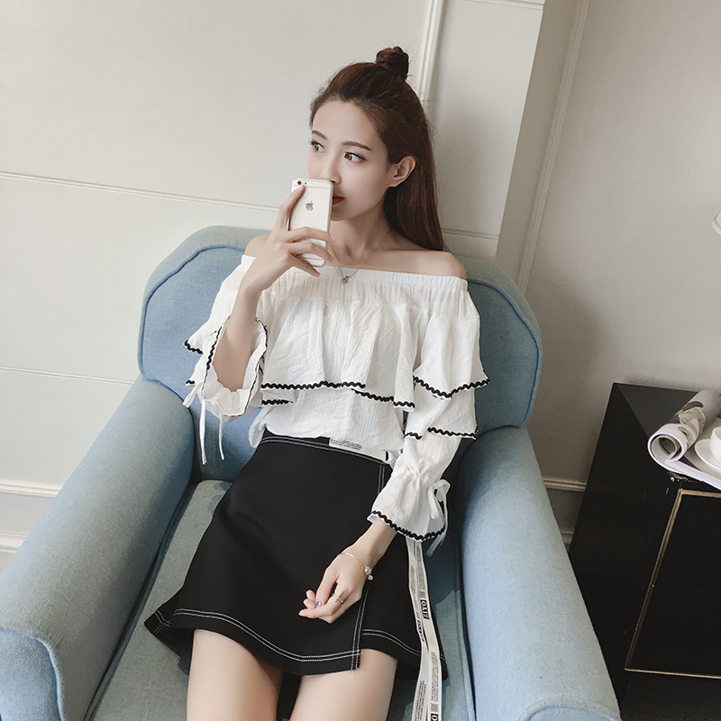 / 春夏新款韓版名媛氣質一字領雪紡衫套裝女高腰半身短裙兩件套