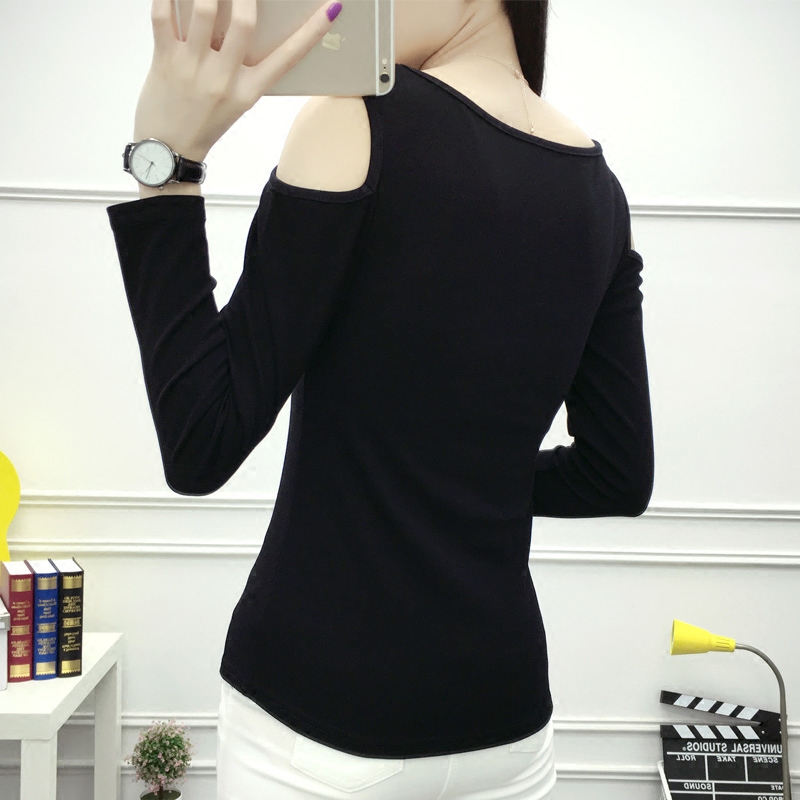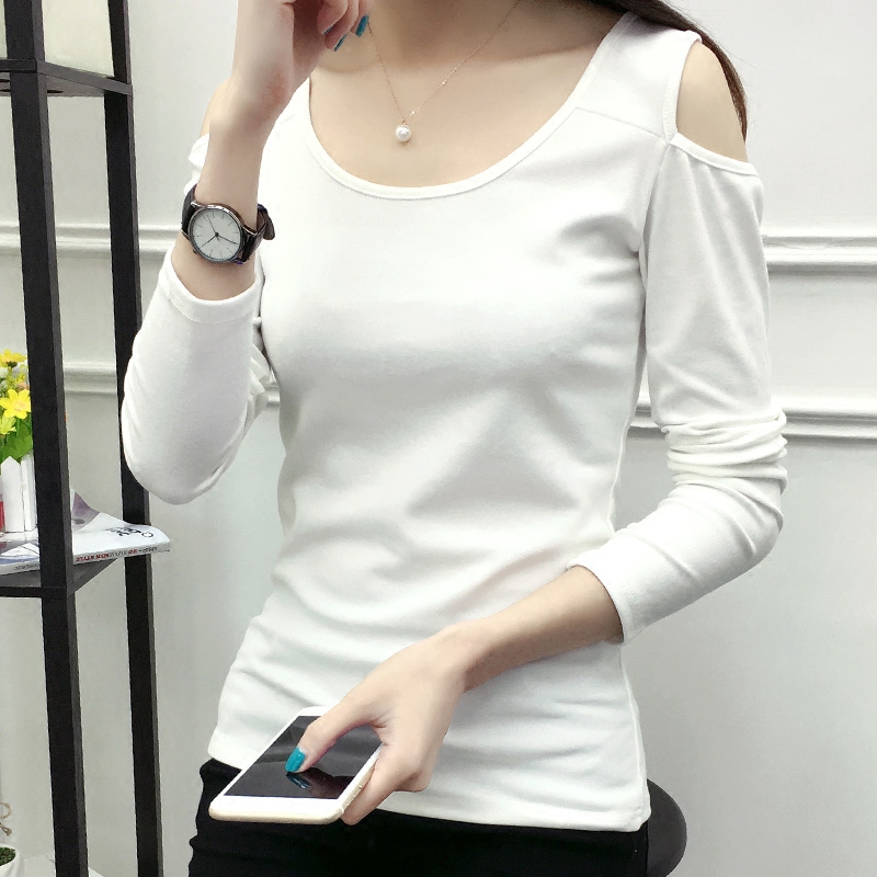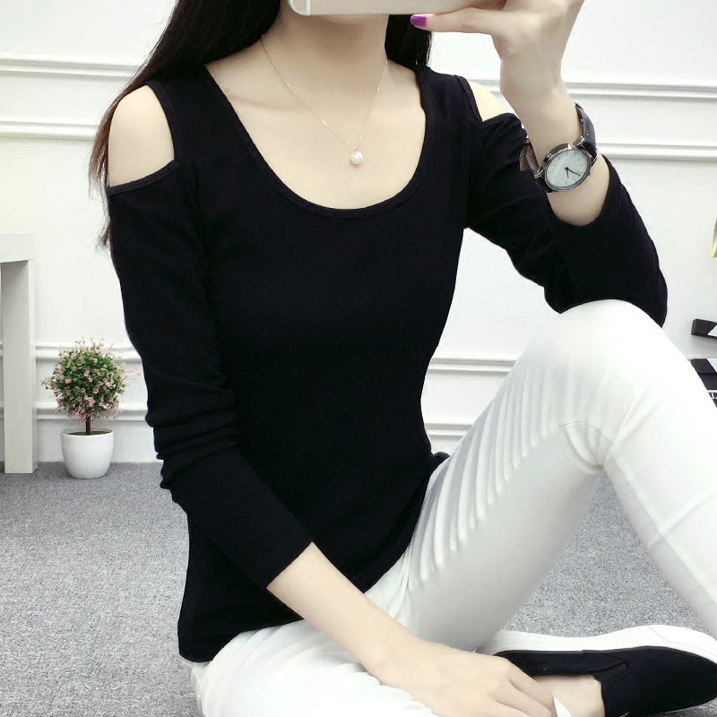 / 春秋新款純色棉質體恤衫大碼顯瘦修身彈力長袖T恤女打底衫