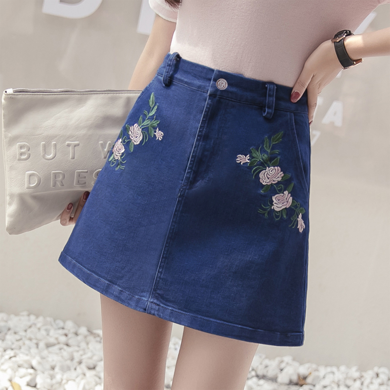 / 高腰牛仔裙半身裙女刺繡A字裙包臀短裙防走光褲裙大碼花朵半裙夏