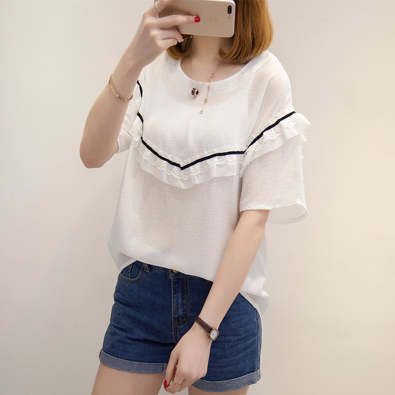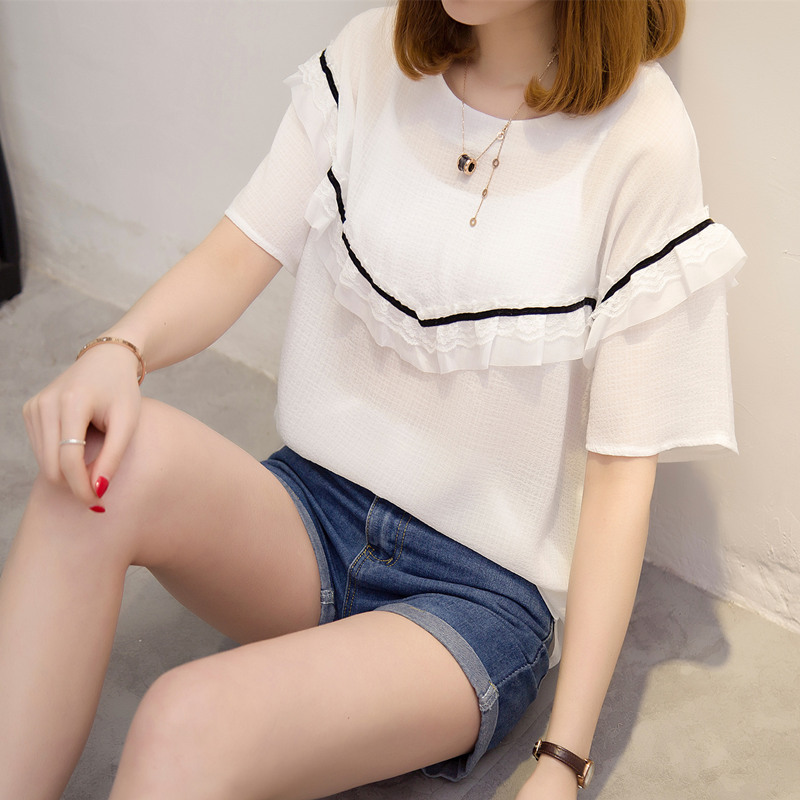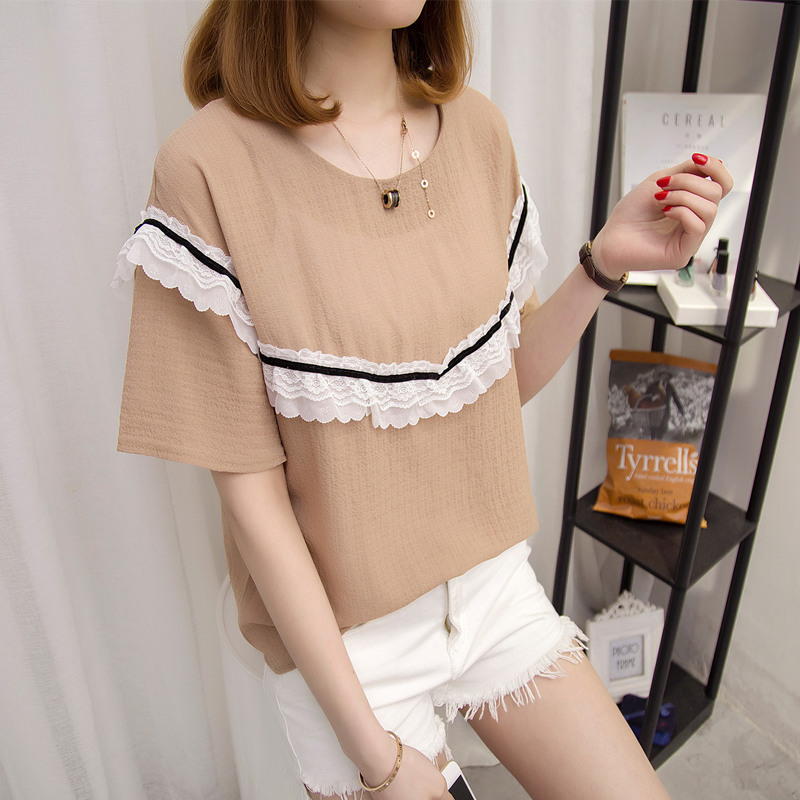/ 夏裝新款女短袖t恤女裝韓版女上衣百搭拼接蕾絲打底體恤衫潮