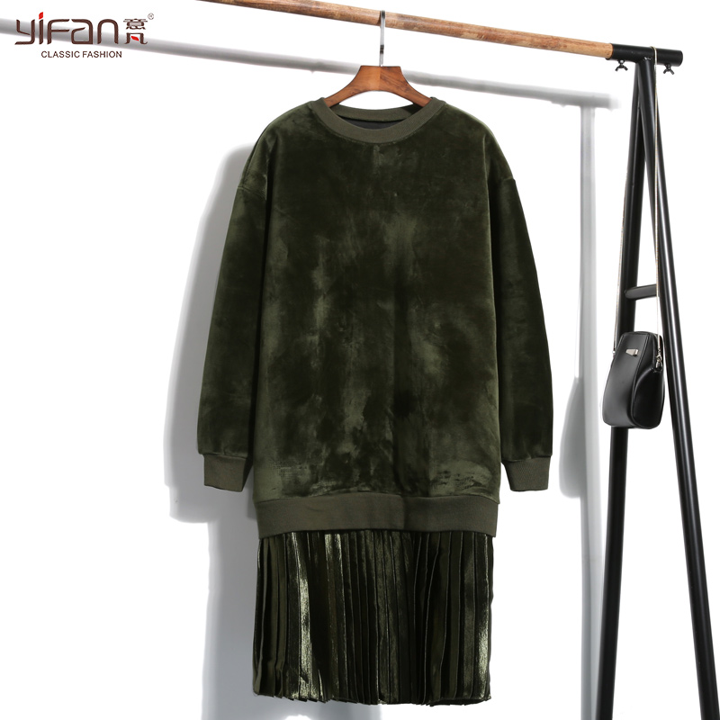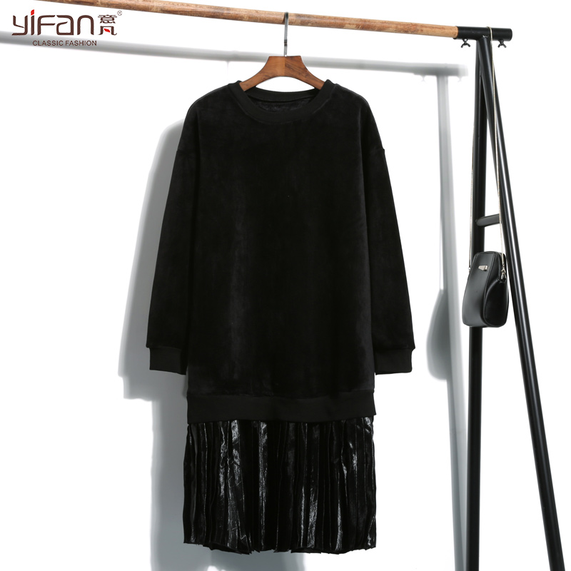 / 韓版套頭拼接百褶連衣裙雙面絨加厚金絲絨假兩件衛衣裙長袖打底裙