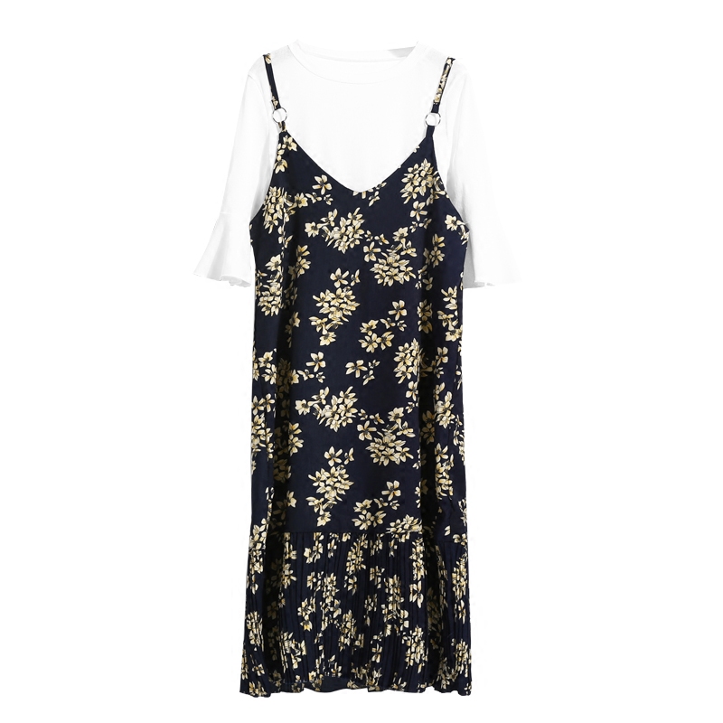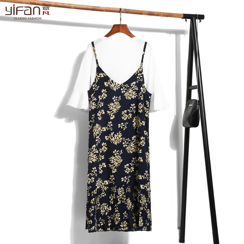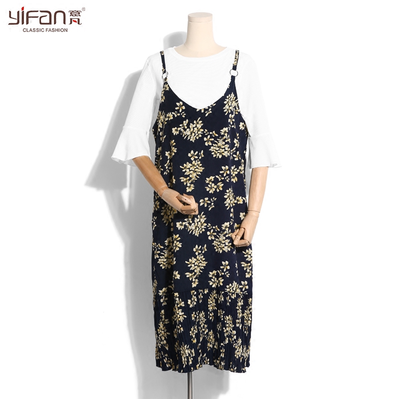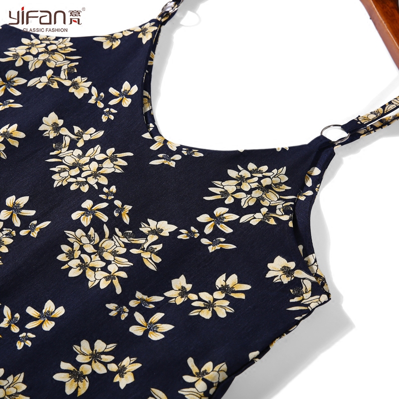 / 春夏新款雪紡碎花裙中長款V領吊帶裙百褶連衣裙復古打底裙潮