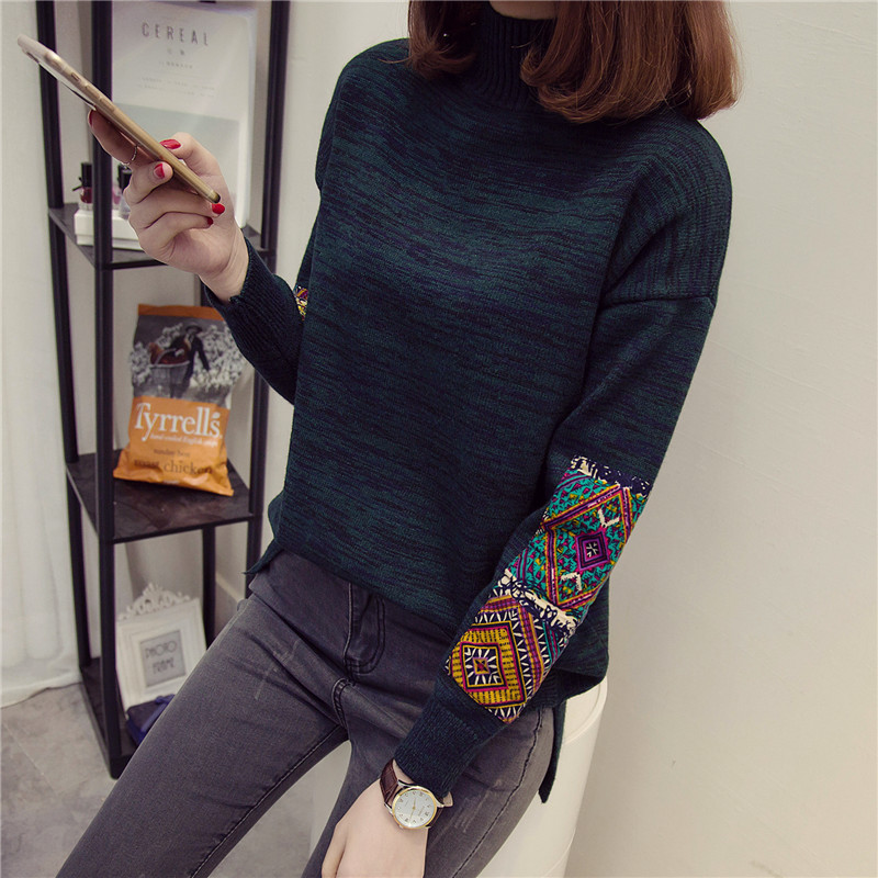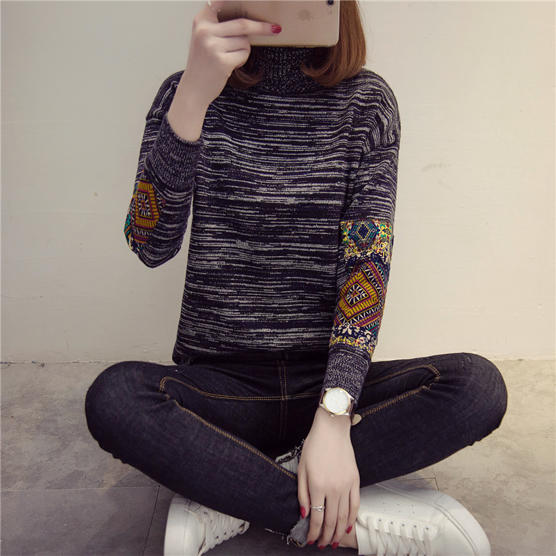 拼色名族風針織衫女套頭打底衫半高領長袖寬松毛衣女秋冬季女裝潮
