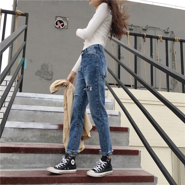 褲子上的破洞是手工磨破拉絲 破洞的邊緣一刀剪變成貓須的效果 時髦洋氣