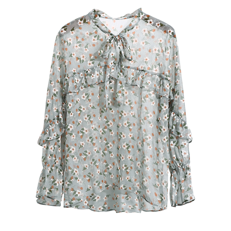 / 春夏新款小碎花喇叭袖雪紡衫女長袖系帶蝴蝶結荷葉邊韓版上衣薄款