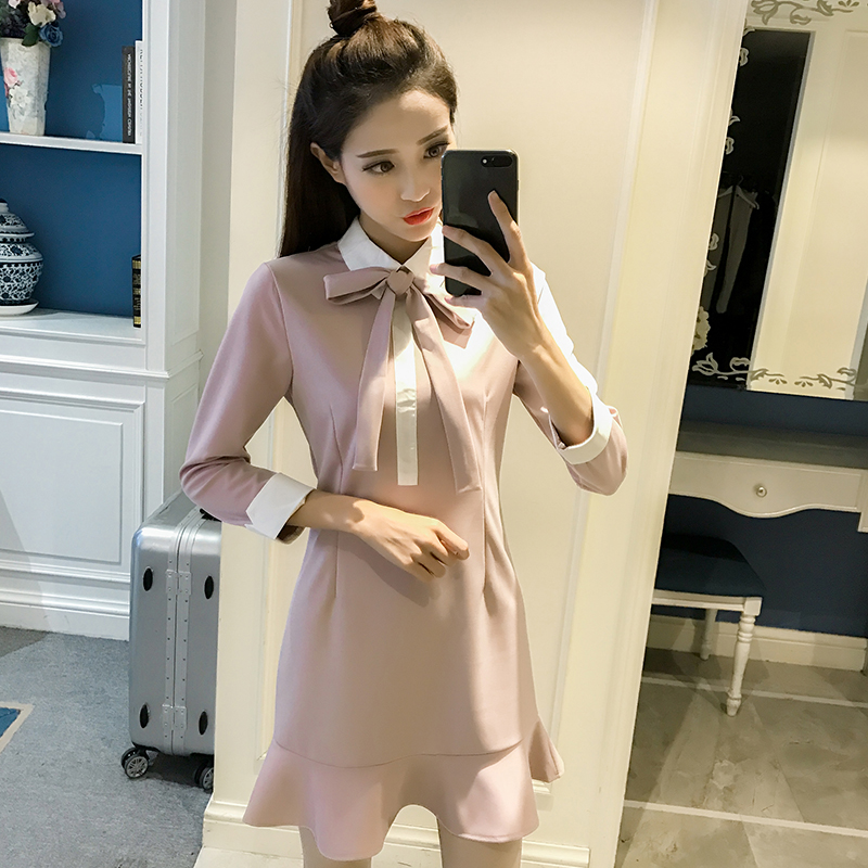 春裝新款韓版蝴蝶結娃娃領修身長袖連衣裙女秋冬荷葉邊打底裙