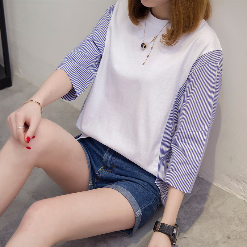 / 白色t恤女中長袖寬松拼接條紋打底衫短袖體恤女裝夏裝新款潮