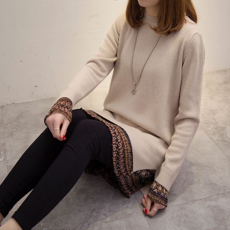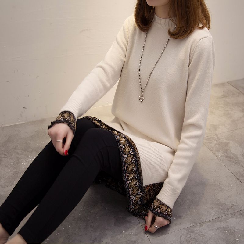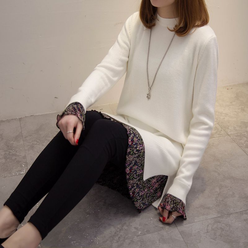 假兩件套頭針織衫中長款新款潮冬季女裝外套上衣寬松純色毛衣
