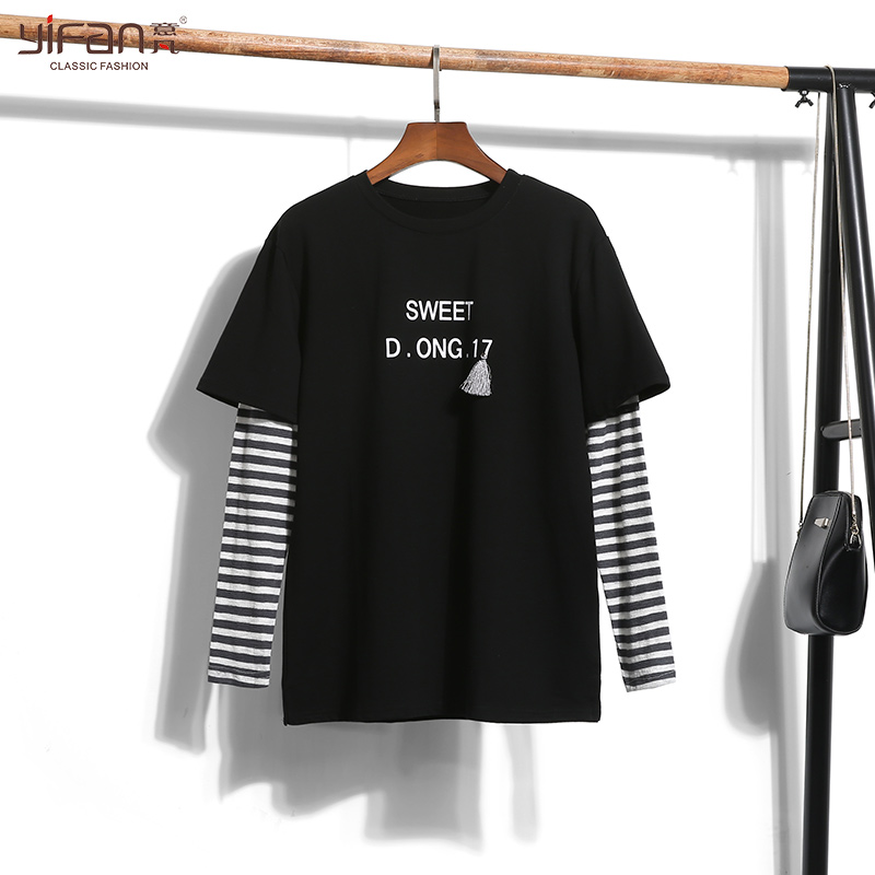 春秋寬松條紋長袖拼接休閑T恤韓版圓領套頭假兩件上衣女裝
