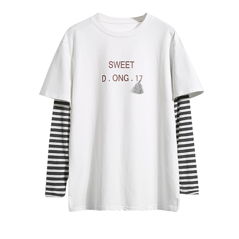/ 春秋寬松條紋長袖拼接休閑T恤韓版圓領套頭假兩件上衣女裝