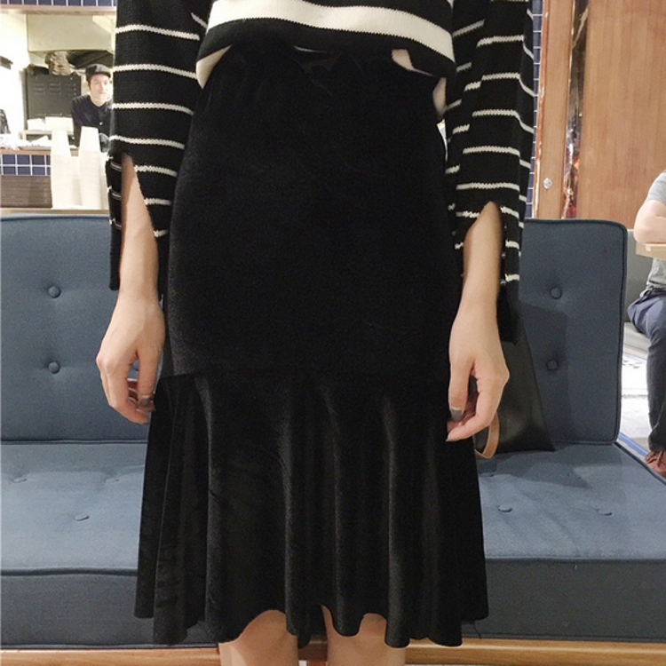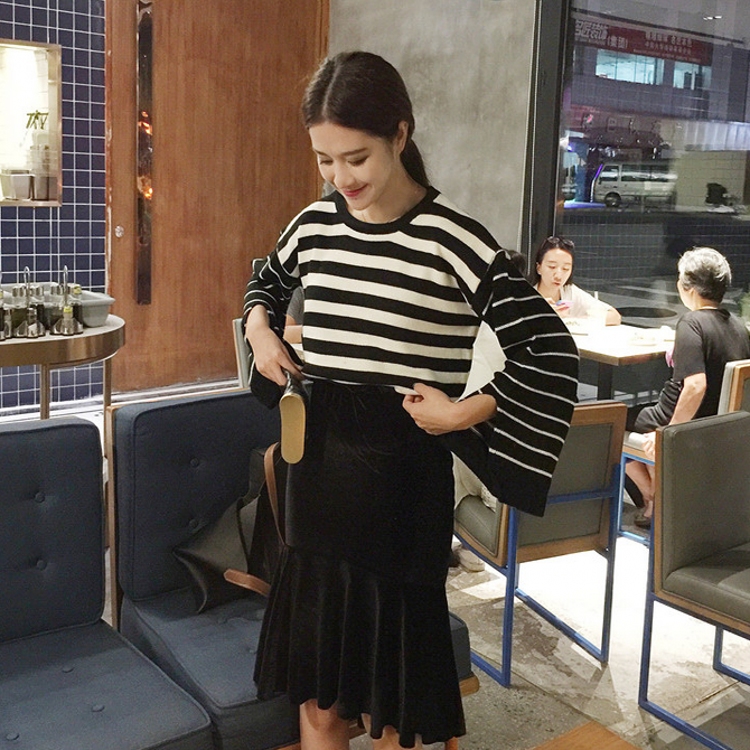 / 秋冬款韓國開叉袖子套頭條紋毛衣+絲絨魚尾純色半身裙套裝女
