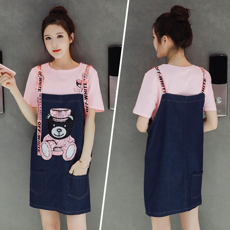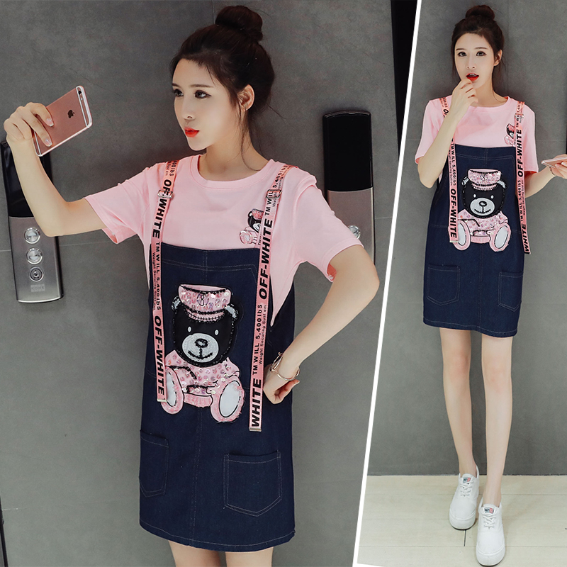 / 時尚套裝女夏裝新款韓版可愛學生牛仔連衣裙寬松背帶兩件套潮