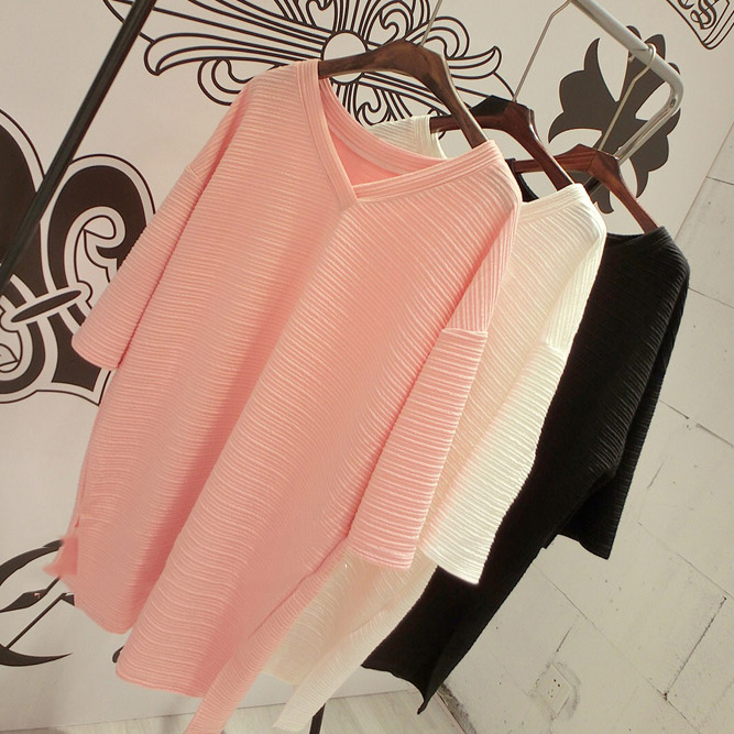 / 春裝女裝新款韓版V領顯瘦七分袖打底衫上衣中長款寬松套頭T恤
