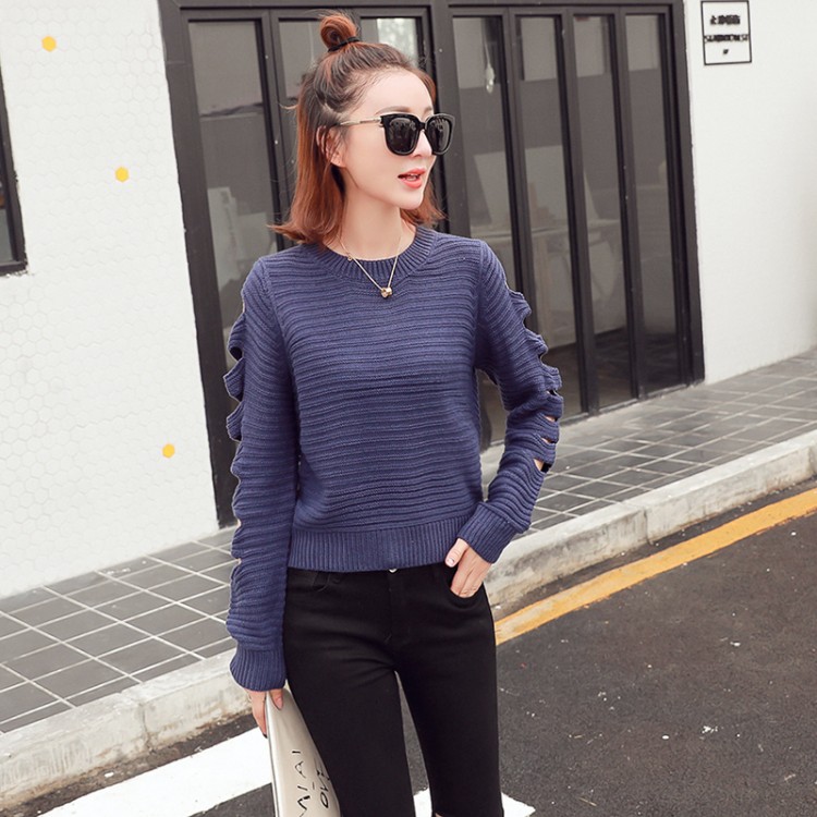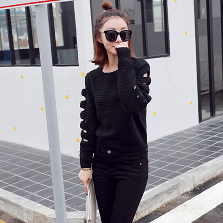 秋冬款韓國寬松顯瘦鏤空長袖上衣圓領套頭純色百搭學生毛衣女
