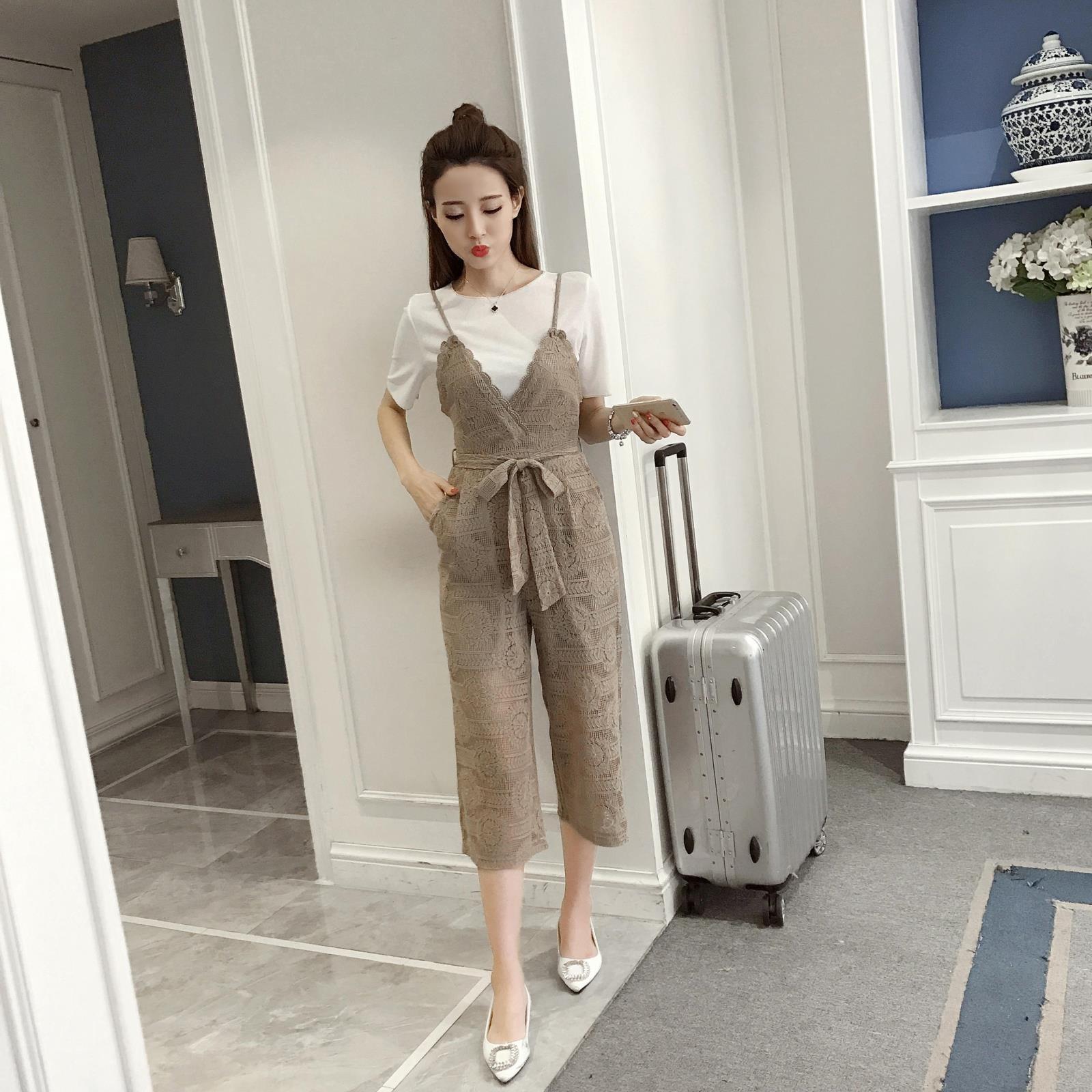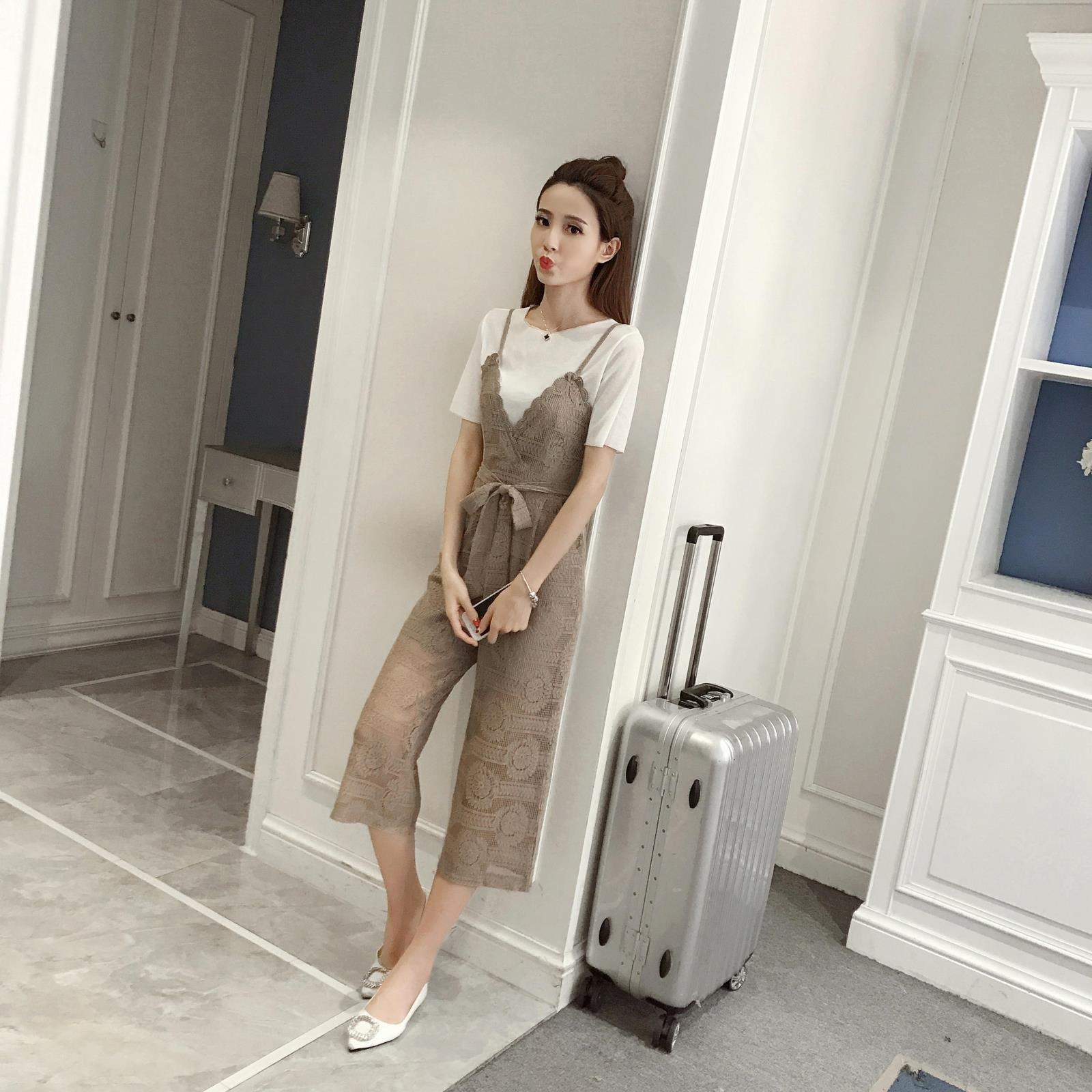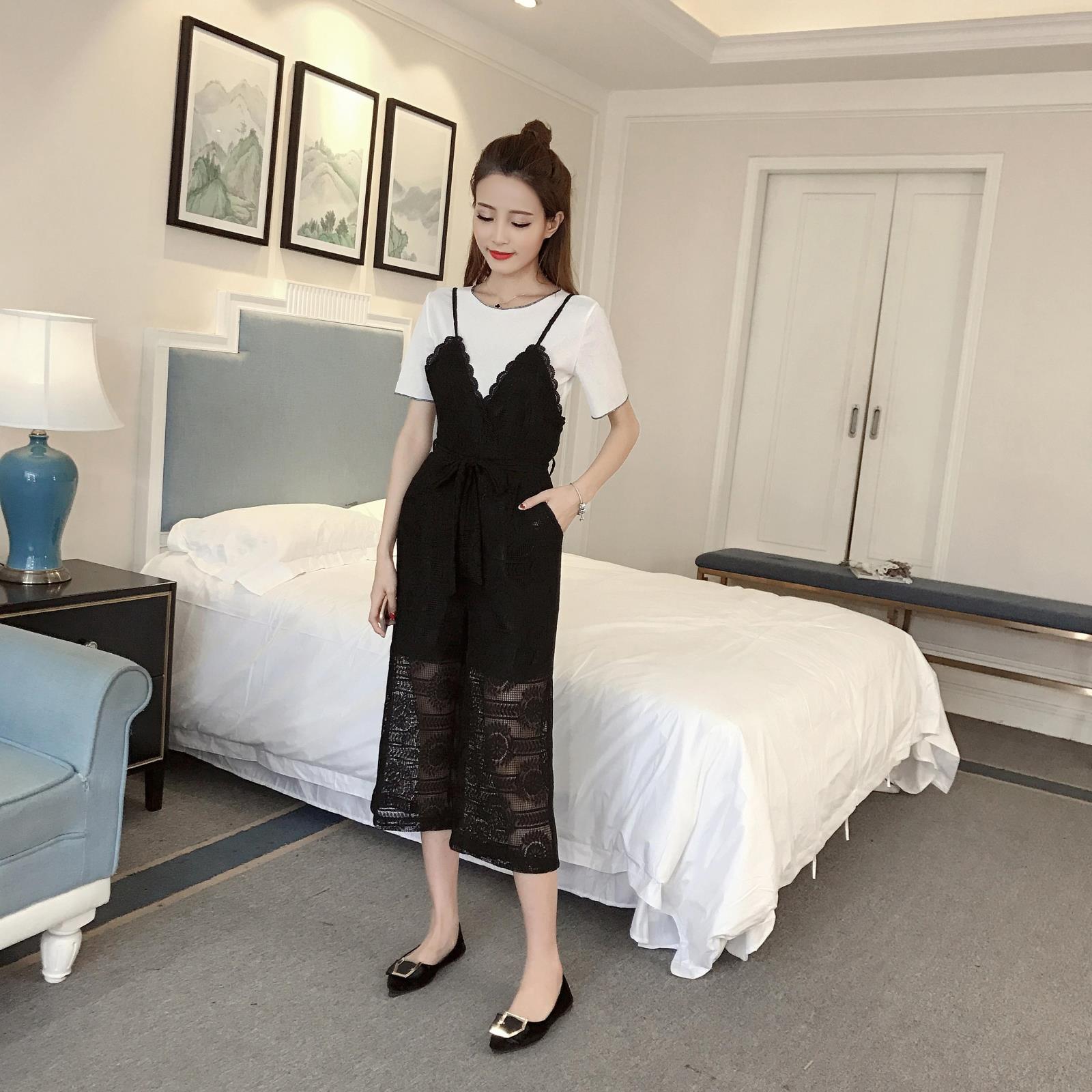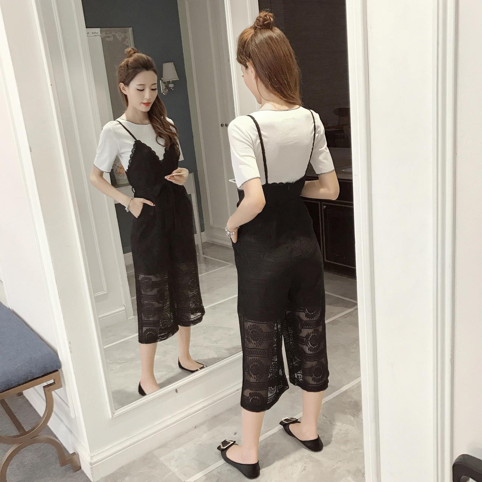 / 新款韓版小香風吊帶連體褲兩件套女休閑七分闊腿褲蕾絲套裝夏