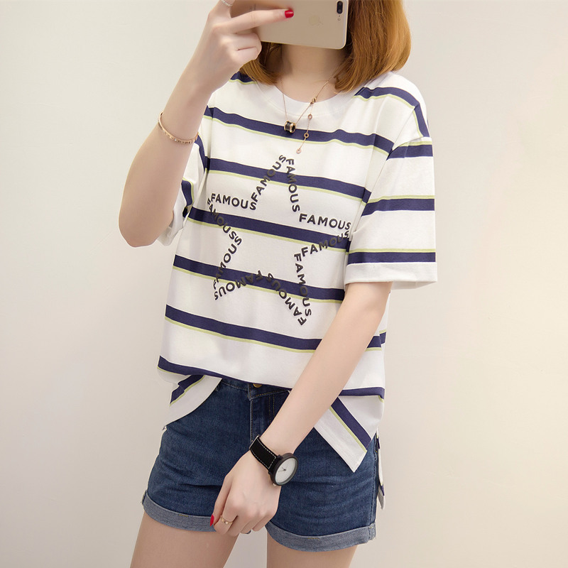 / 條紋t恤女短袖韓版潮夏裝新款女裝開叉時尚體恤百搭上衣女夏