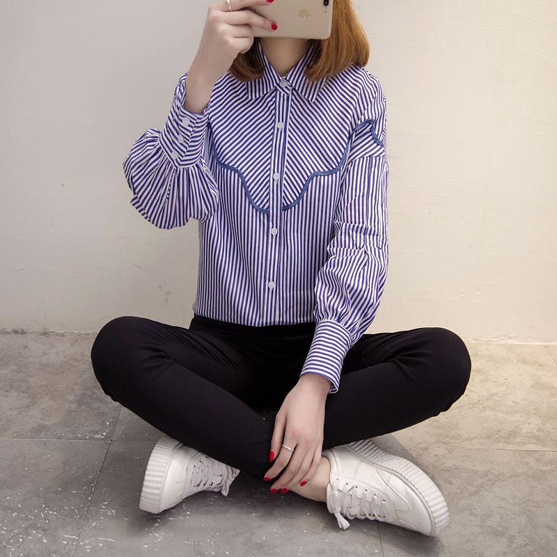 襯衫女長袖寬松韓版百搭休閑條紋襯衣女裝春裝新款潮學生上衣