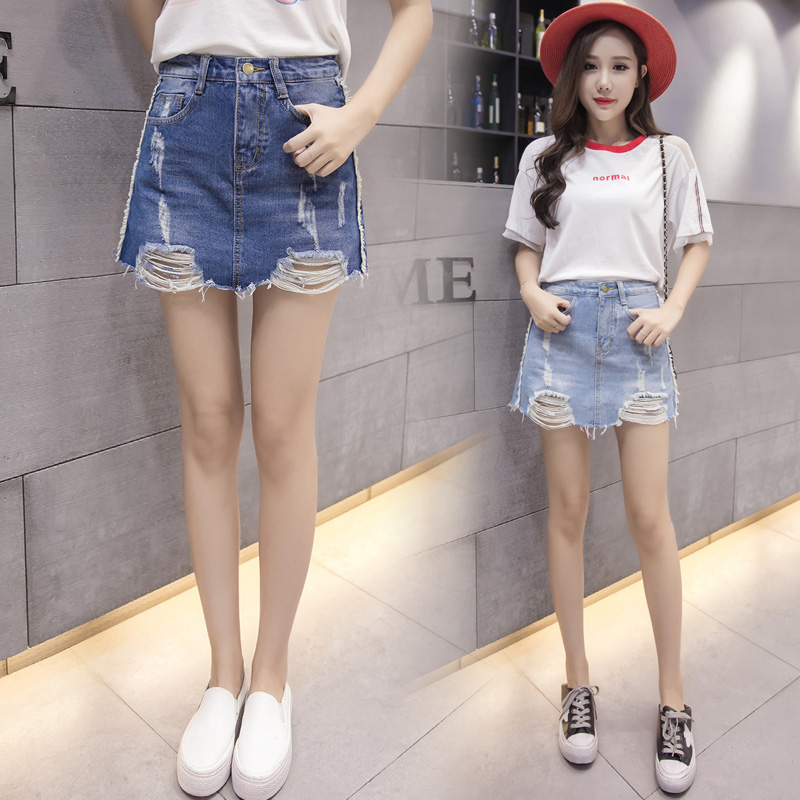 / 韓版高腰破洞牛仔裙半身裙女防走光短裙A字裙包臀褲裙半裙夏包裙