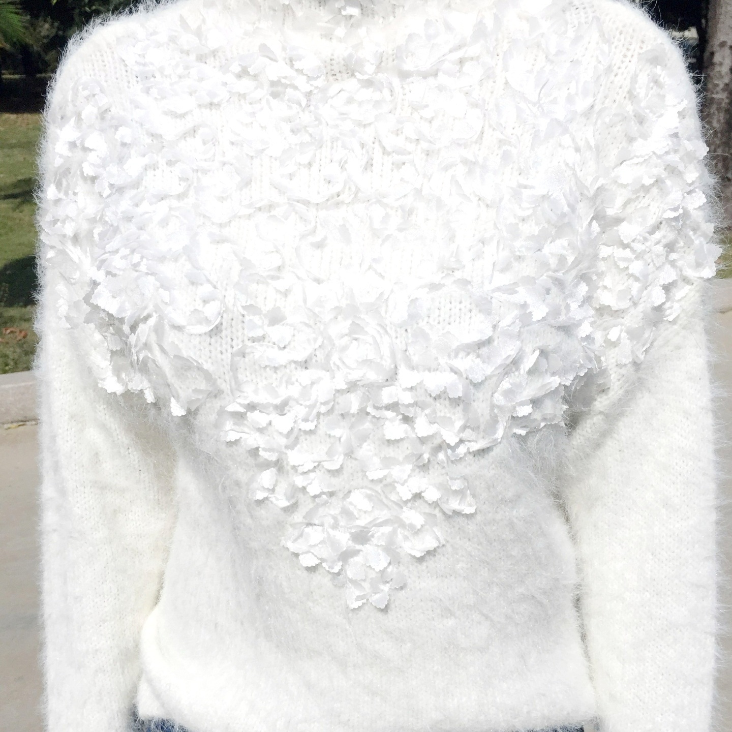 / 韓國秋冬款百搭時尚立體盤花圓領套頭白色保暖打底針織毛衣女