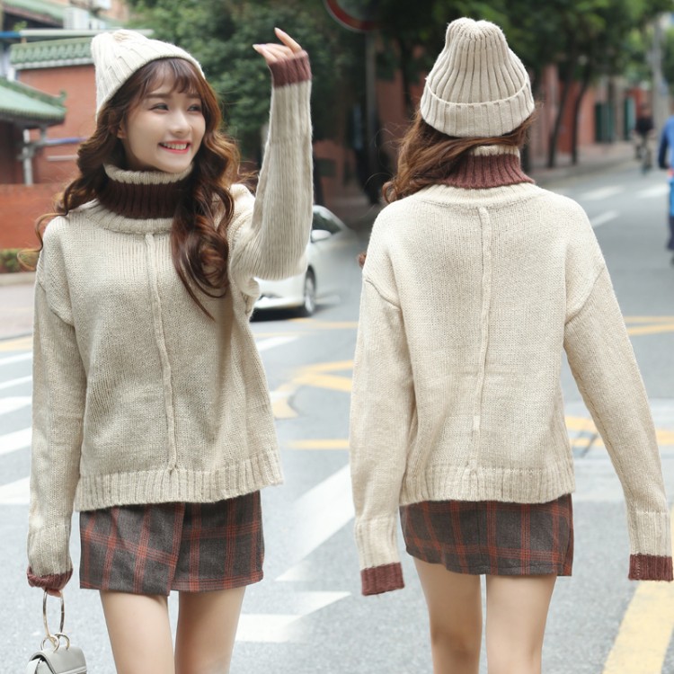 / 冬款韓國ulzzang加厚顯瘦高領套頭拼色微彈力寬松百搭毛衣女