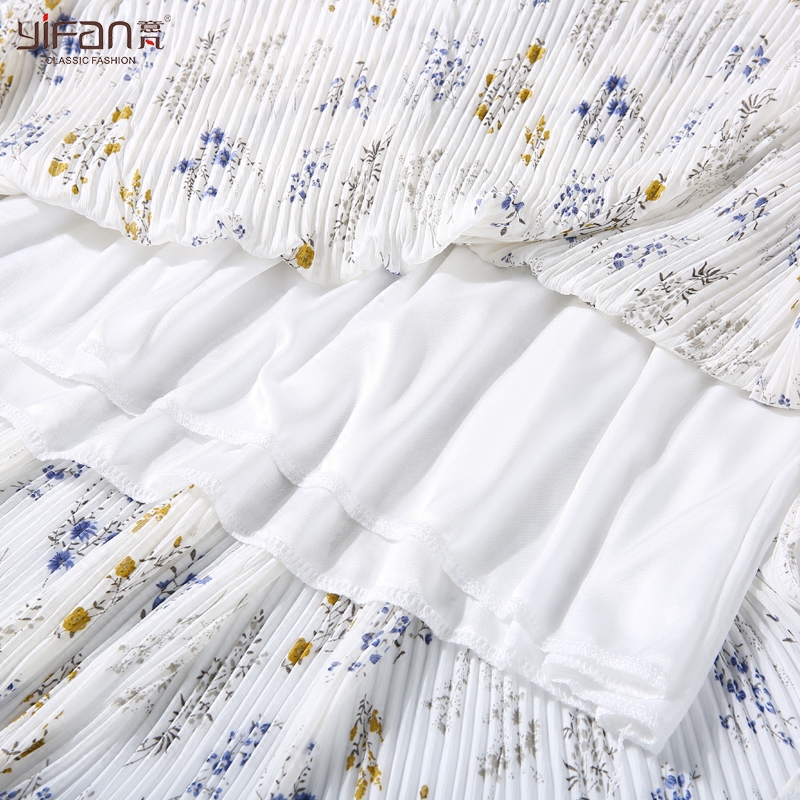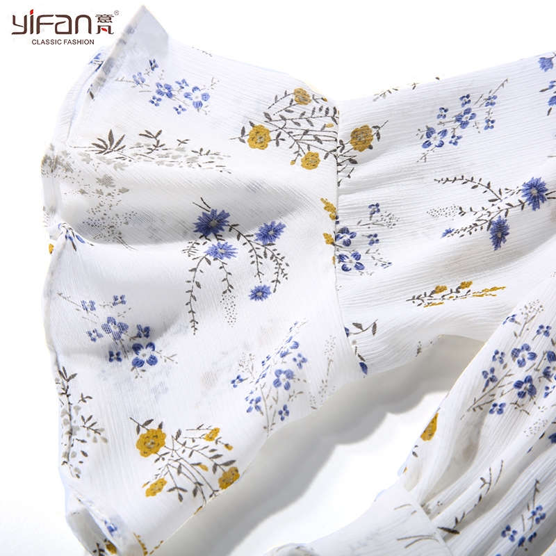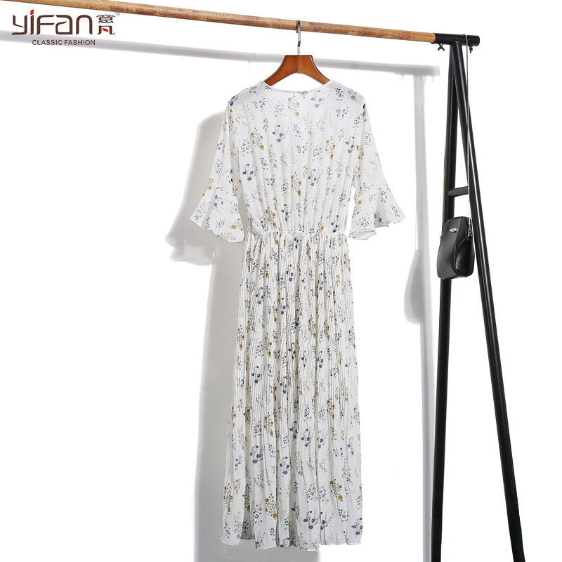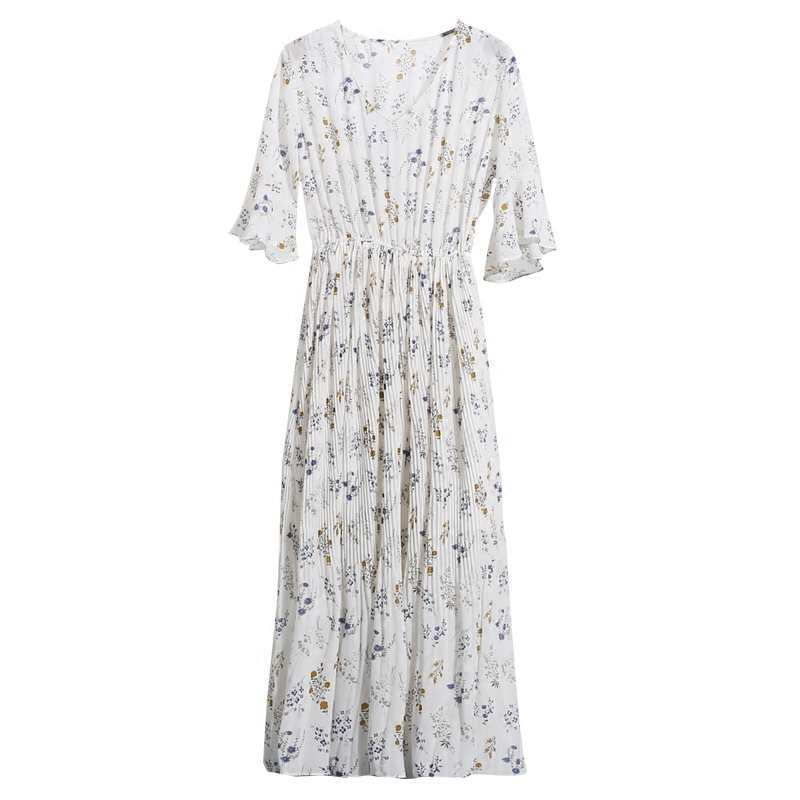 / 夏季新款韓版喇叭袖V領五分袖印花雪紡連衣裙女碎花沙灘長裙