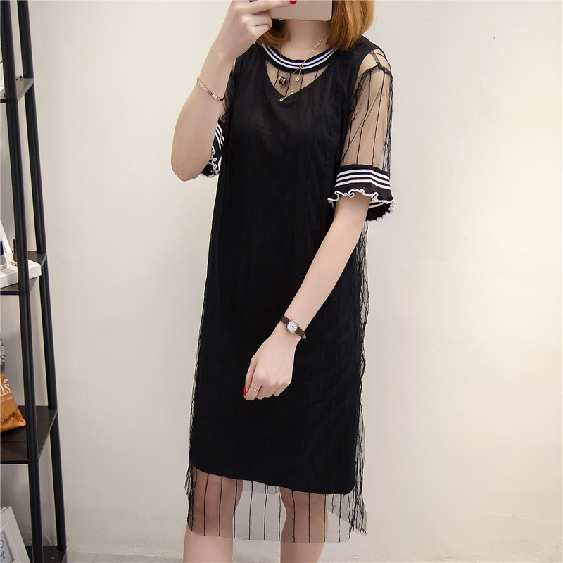 短袖t恤女長款兩件套裝春夏女裝新款潮網紗寬松韓版體恤打底