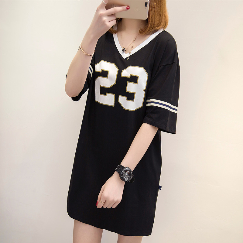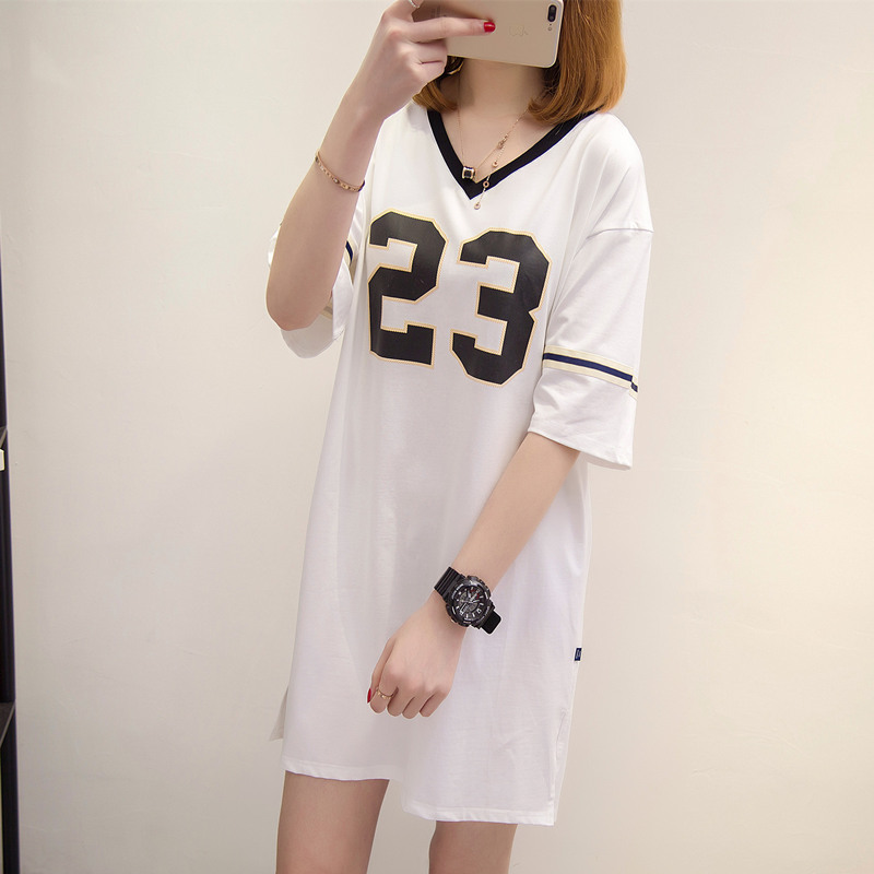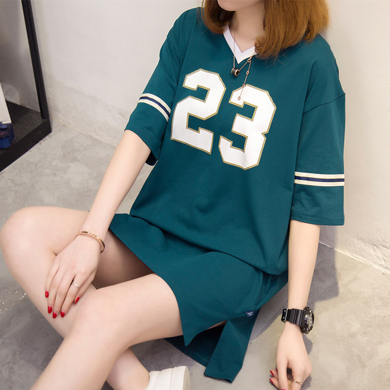 夏季女裝新款中長款V領中長款t恤女短袖寬松上衣女百搭體恤衫