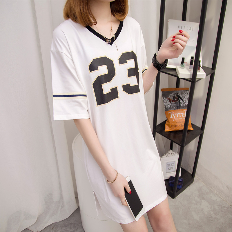 / 夏季女裝新款中長款V領中長款t恤女短袖寬松上衣女百搭體恤衫