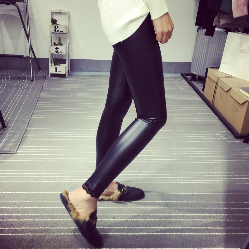 / 韓國顯瘦蕾絲PU皮褲秋冬彈力百搭外穿打底褲女黑色小腳褲長褲
