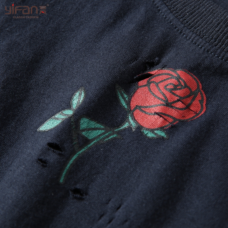 / 夏季寬松上衣韓國休閑破洞圓領短袖T恤女套頭玫瑰印花做舊