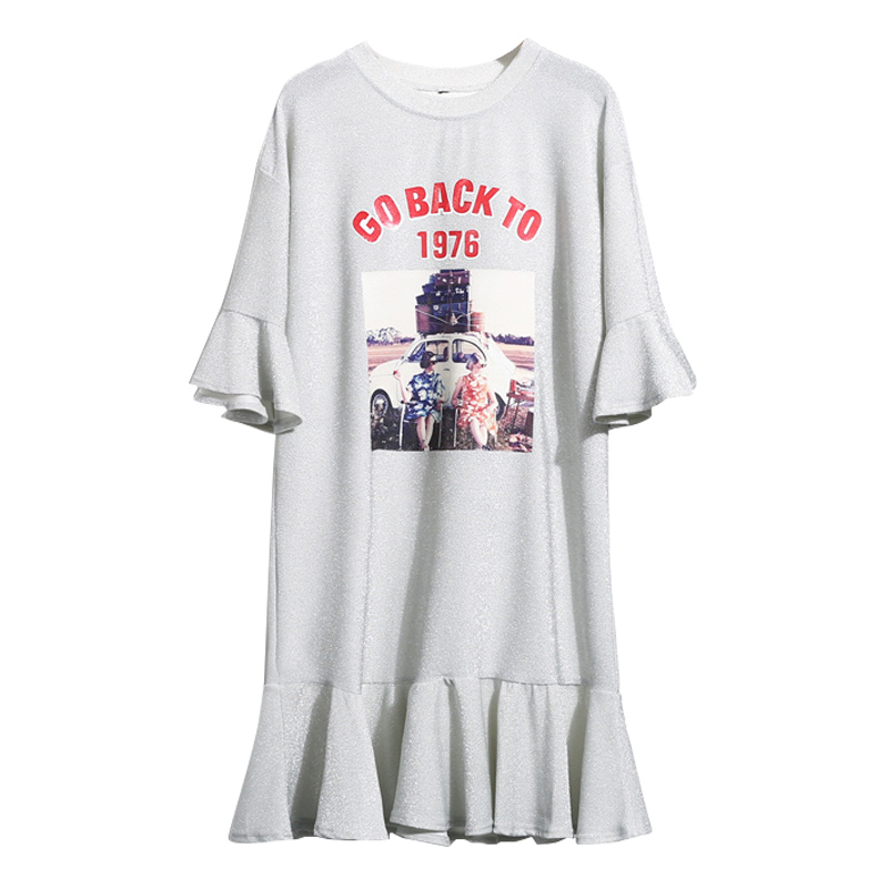 / 夏季中長款喇叭袖T恤裙女裝韓版寬松七分袖荷葉邊印花體恤裙