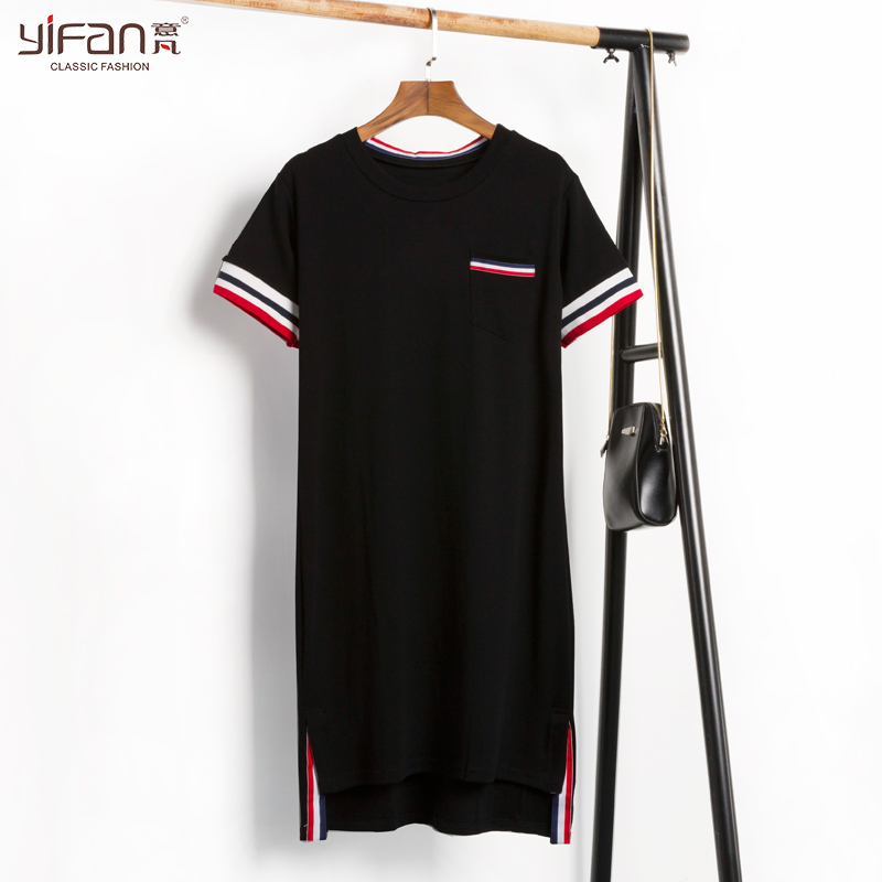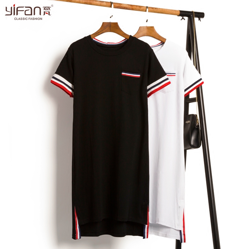 / 夏裝短袖側開叉運動純棉白色休閑寬松加長T恤中長款體恤連衣裙女