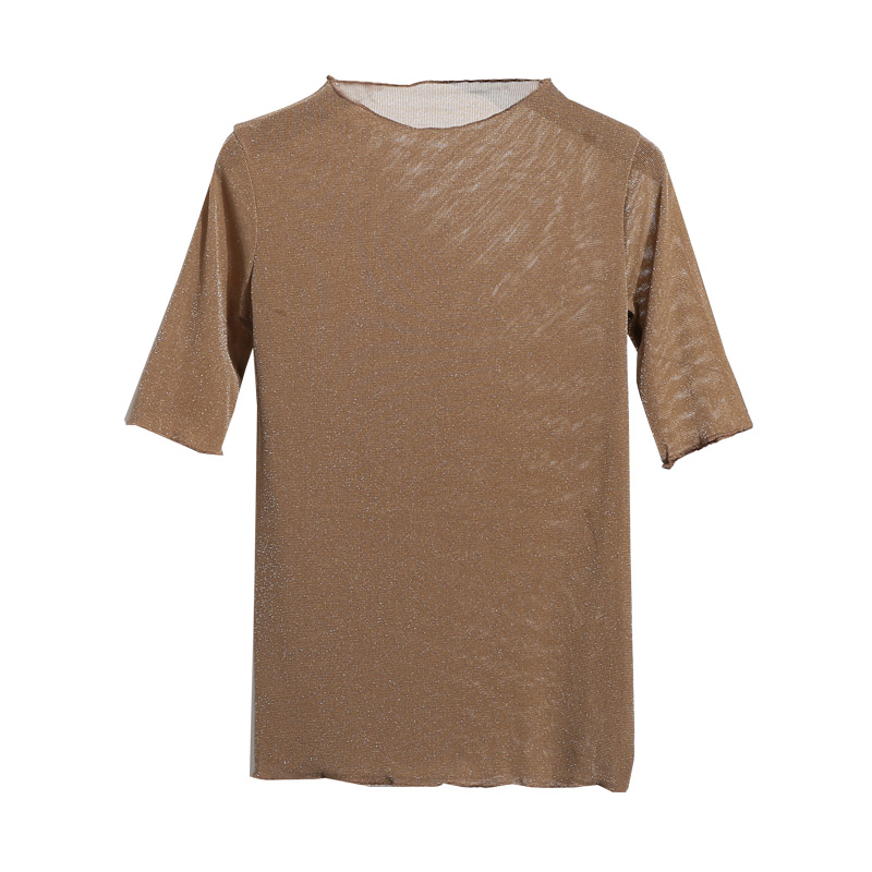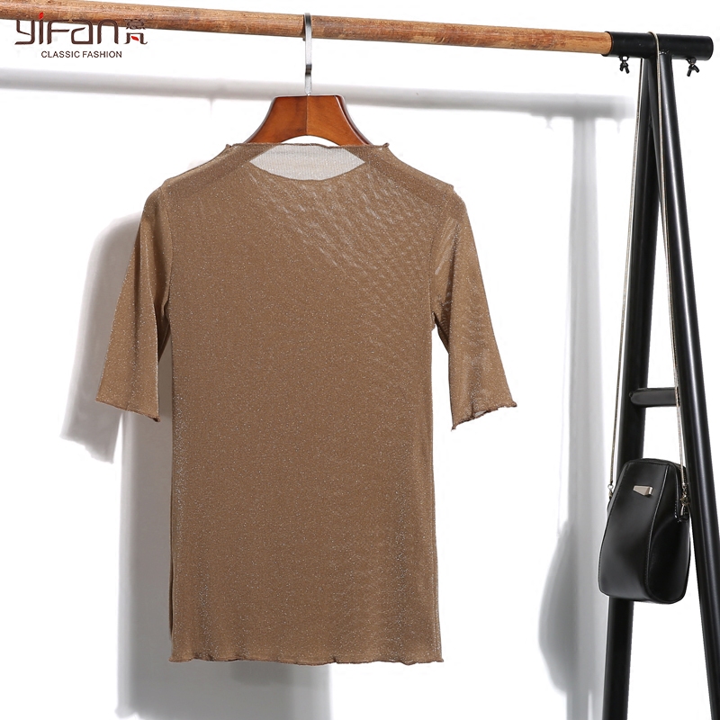 / 夏季透視雙層網紗彈力緊身打底衫5分袖體恤亮絲套頭女士中袖T恤