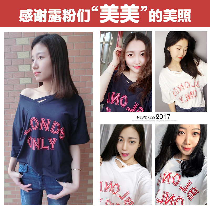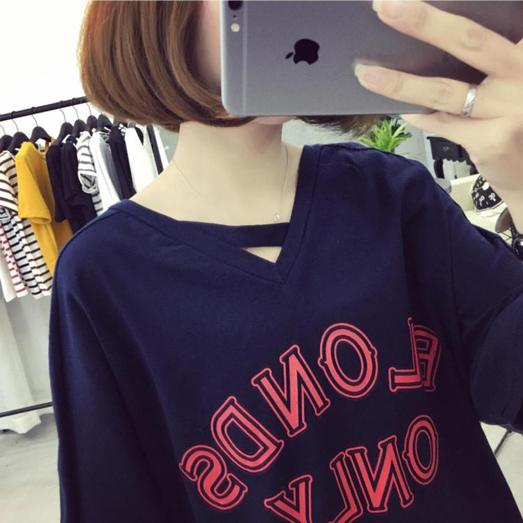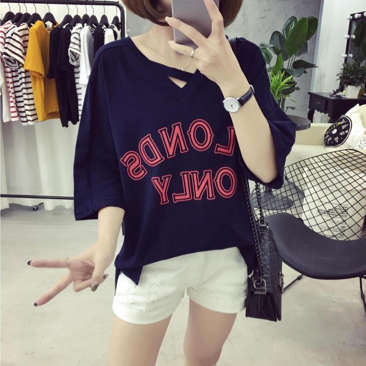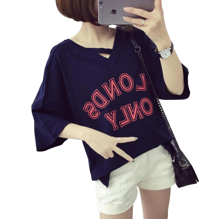 / 韓版夏裝字母半袖上衣鏤空V領大碼夏季短袖t恤女學生寬松小衫