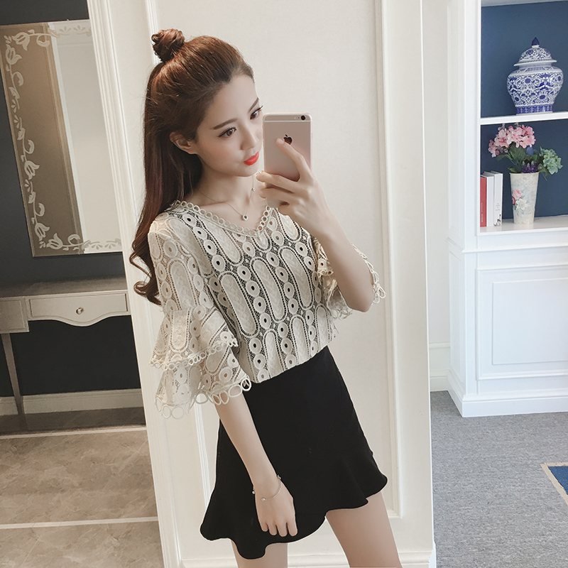 小衫春夏新款女裝韓版喇叭袖上衣女顯瘦百搭七分袖V領蕾絲衫