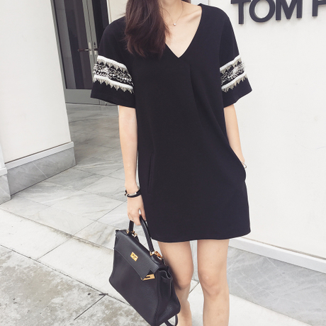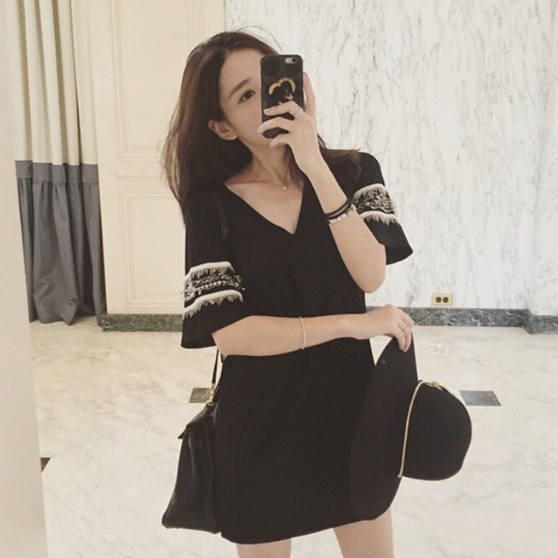 夏季新款女裝韓版寬松赫本小黑裙顯瘦中裙子時尚民族風連衣裙