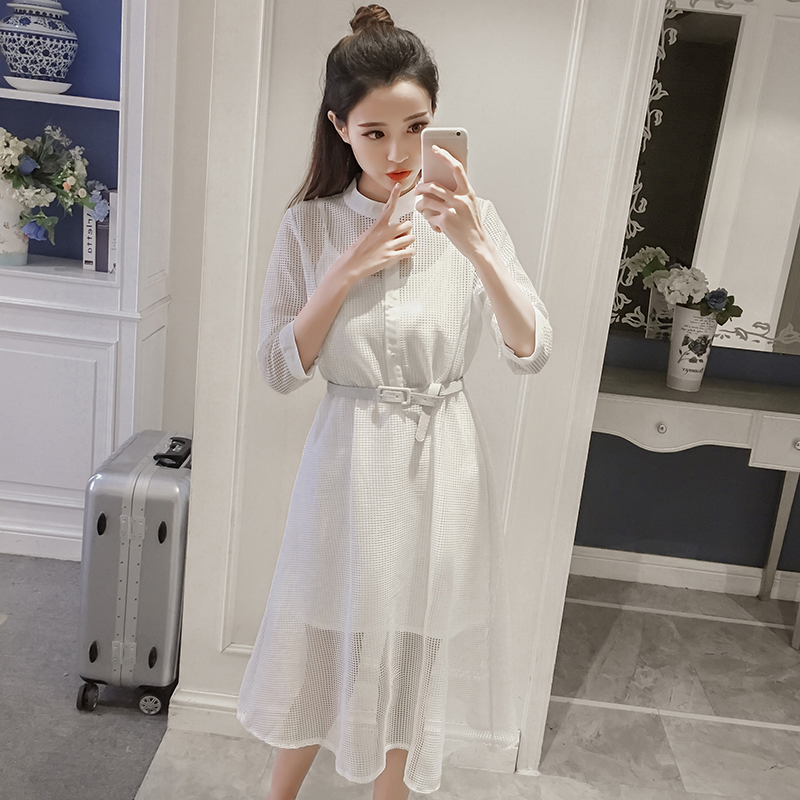 / 春夏季新款女裝韓版中長款修身顯瘦七分袖網紗襯衫連衣裙套裝