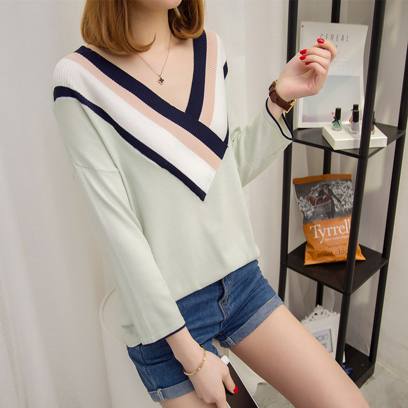 女裝春裝新款女韓版寬松V領針織衫長袖打底衫顯瘦上衣百搭潮