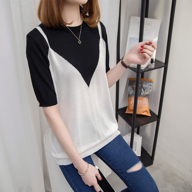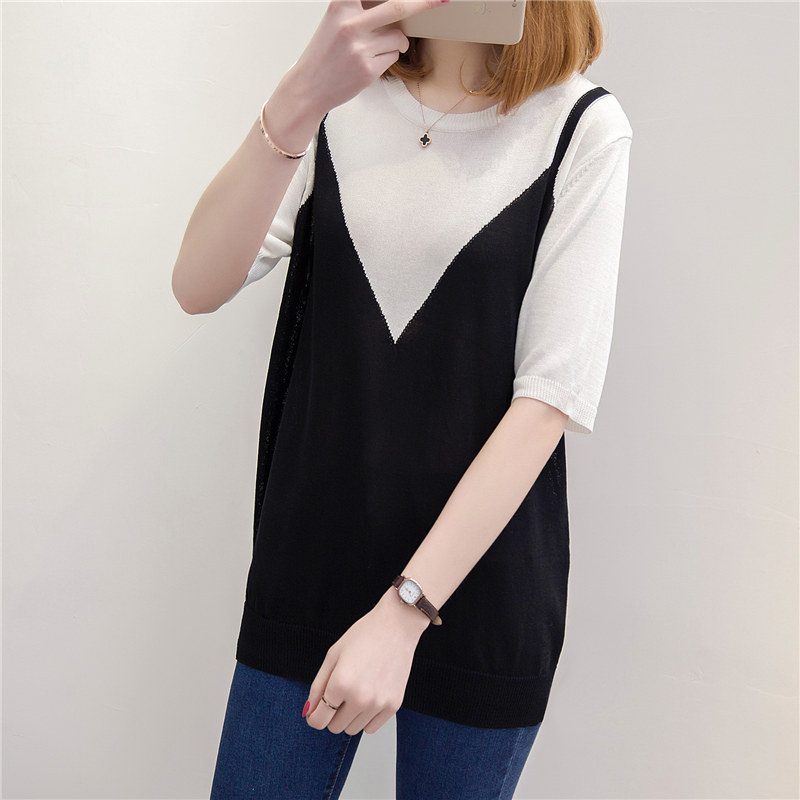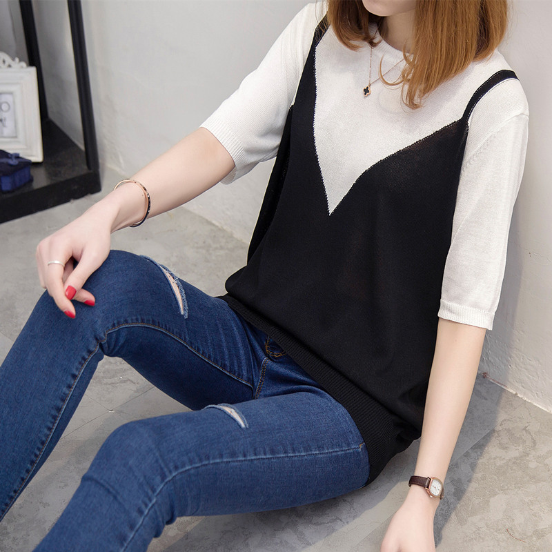/ 夏裝新款短袖t恤女韓版拼色假兩件短袖t恤女上衣打底衫體恤