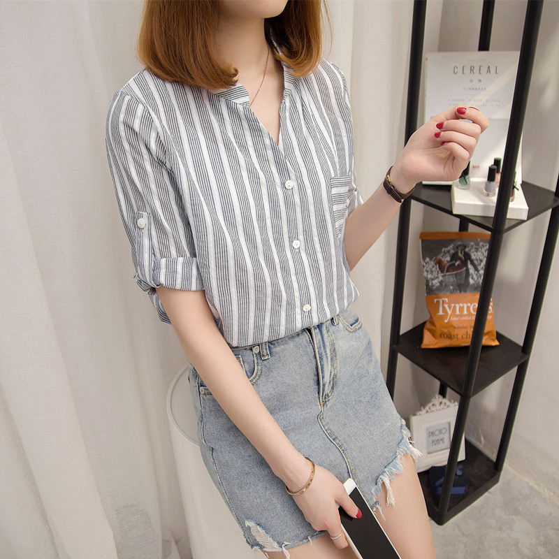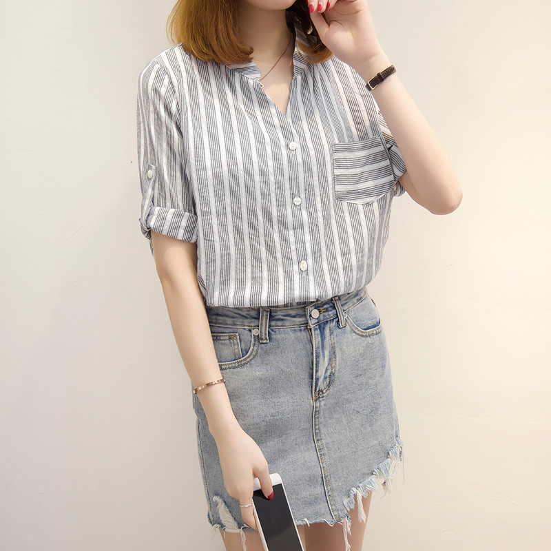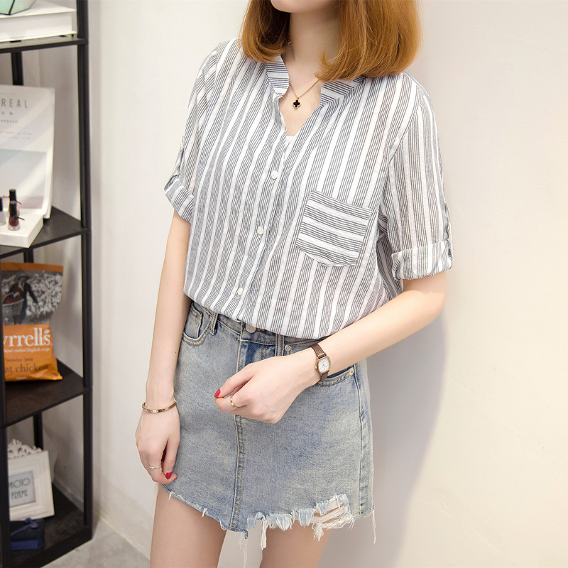 / 夏裝新款hm女裝條紋襯衫女上衣寬松韓范小清新短袖襯衣女學生