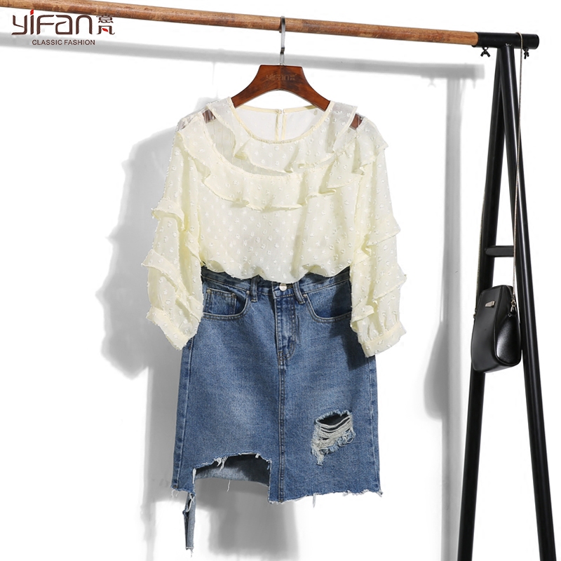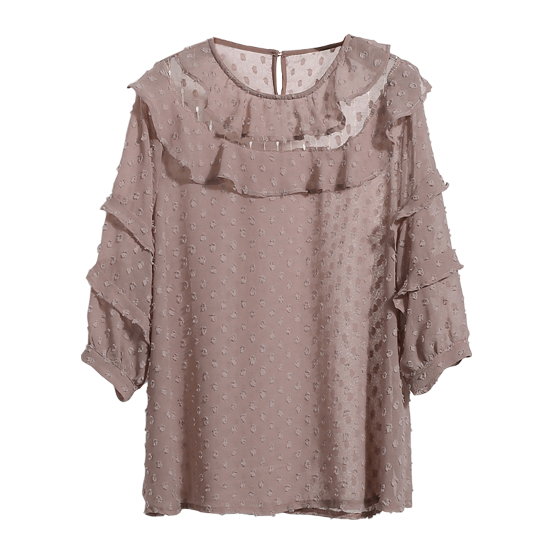 夏季新款韓范百搭七分袖荷葉領雪紡衫蝙蝠袖拼接網紗襯衫女