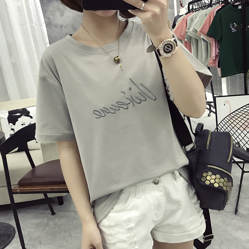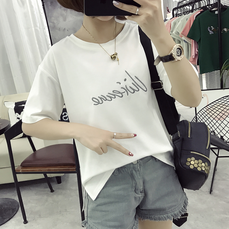 / 夏裝寬松新款刺繡t恤女簡約閨蜜裝短袖女上衣顯瘦韓版潮體恤