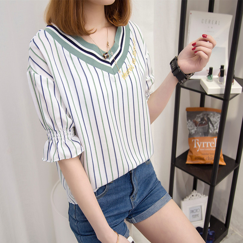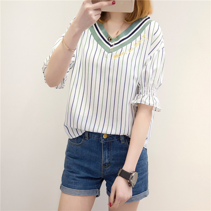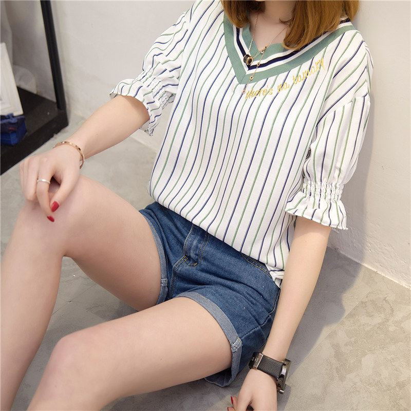 / 夏裝新款女裝上衣春季韓版V領豎條紋短袖t恤女白色寬松體恤衫