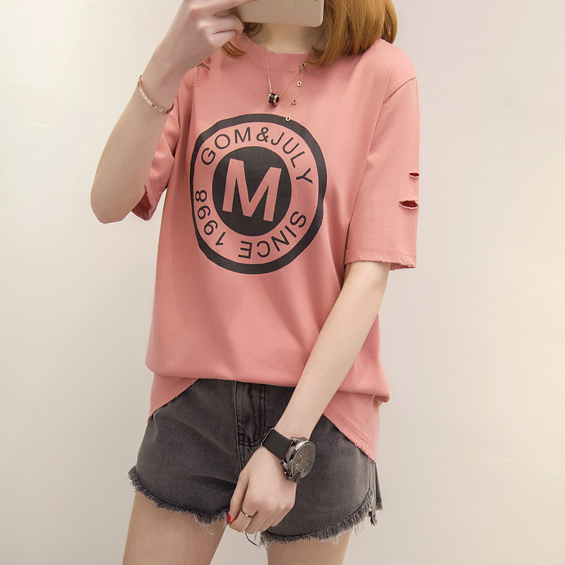 新款潮韓版春季女裝短袖t恤女寬松破洞韓版學生上衣體恤打底