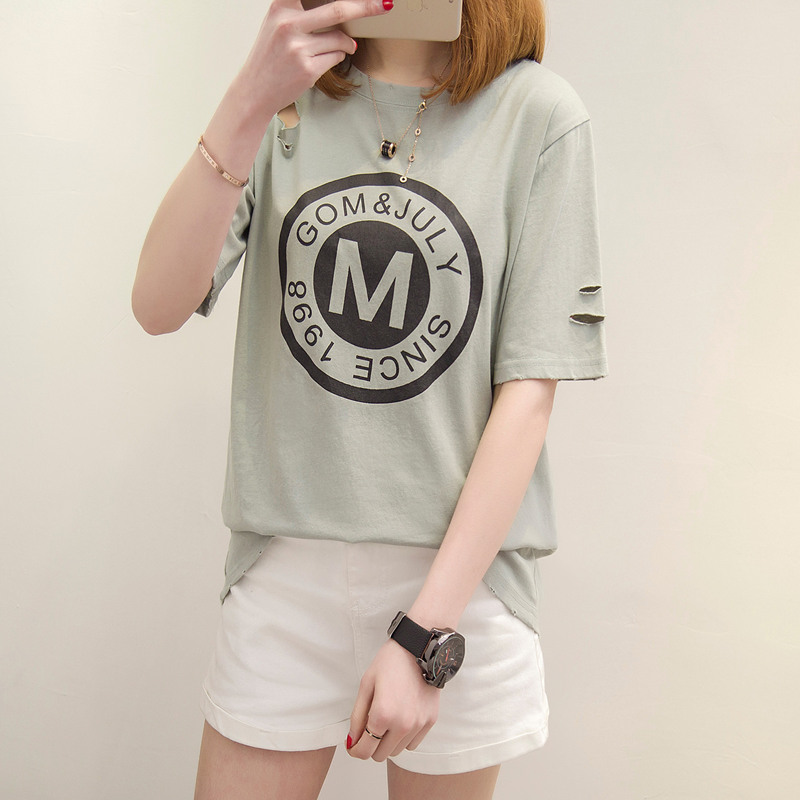 / 新款潮韓版春季女裝短袖t恤女寬松破洞韓版學生上衣體恤打底