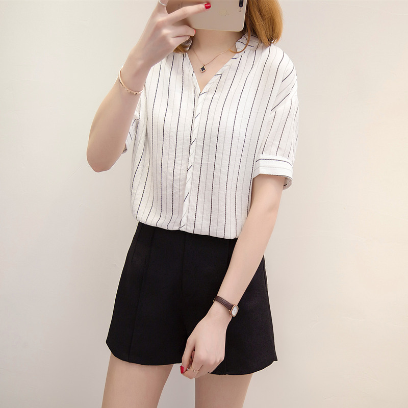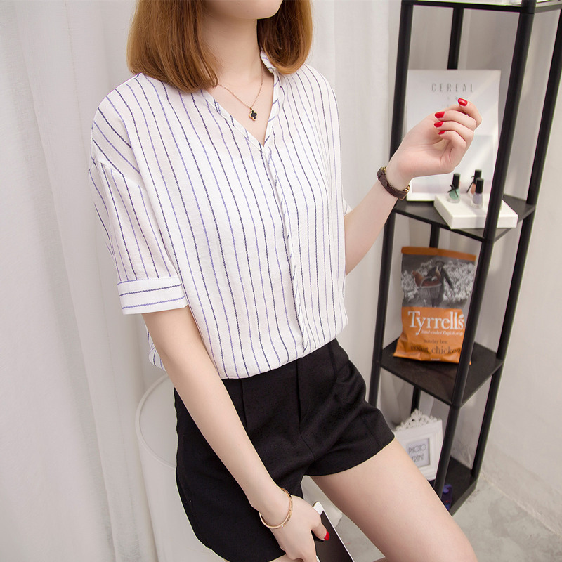 / 條紋襯衫女夏短袖上衣寬松時尚韓版打底衫V領春裝女裝新款潮